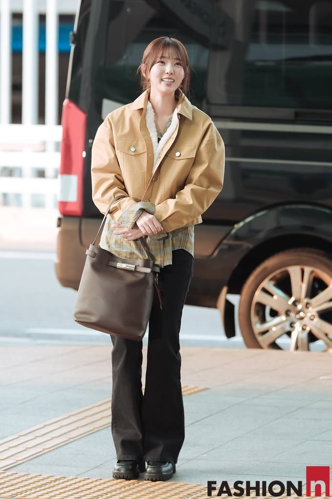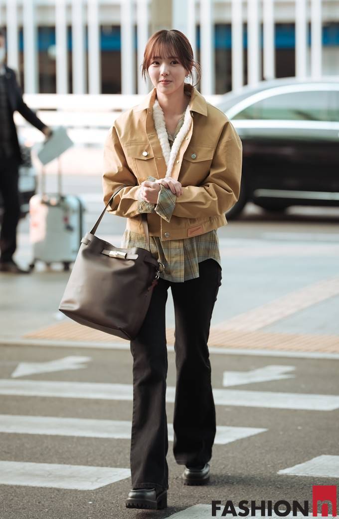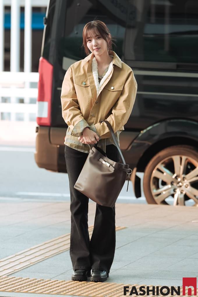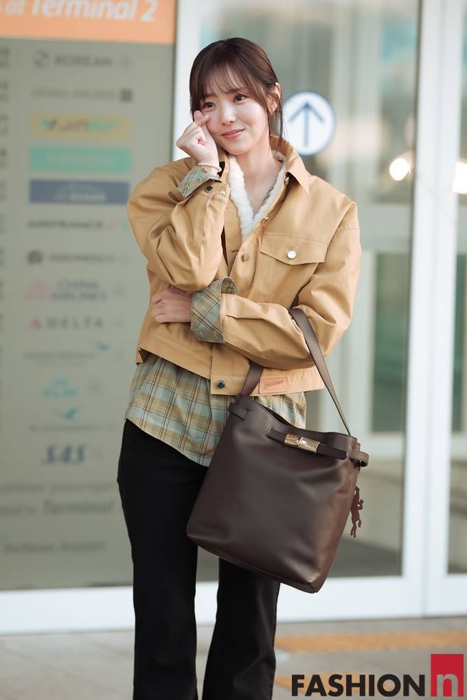 이날 채수빈은 루즈하게 드러난 체크 셔츠 위에 베이지 블루종 재킷을 입고 블랙 진을 매치한 출국룩으로 러블리하면서도 청순한 매력을 발산했다.