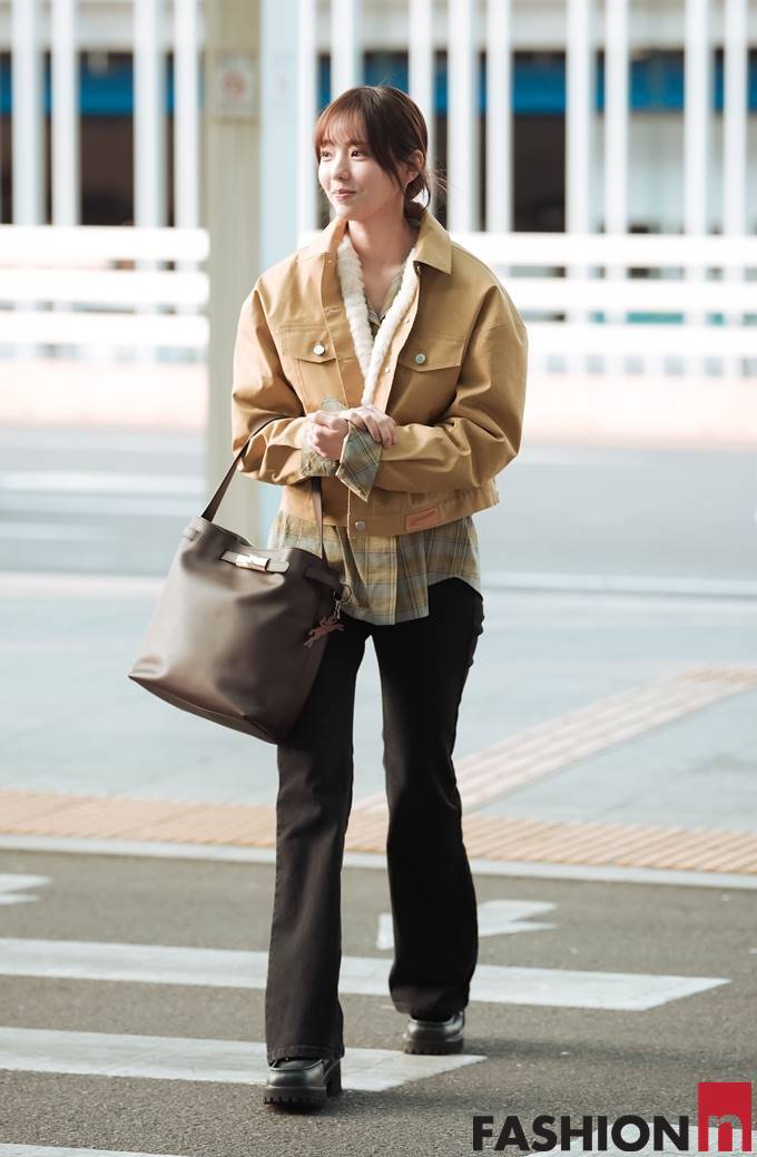 배우 채수빈이 체크 셔츠 위에 베이지 블루종 재킷을 걸친 봄 레이어드룩으로 공항을 밝혔다.