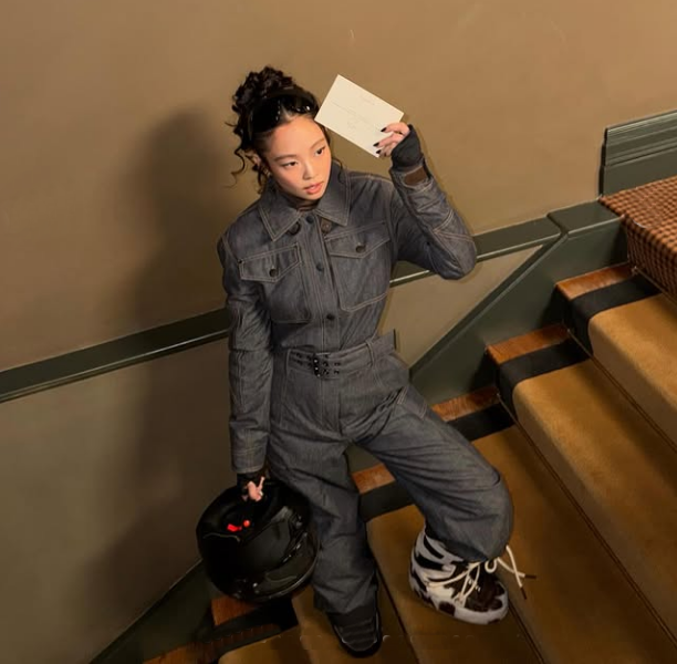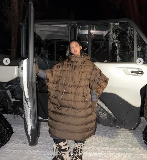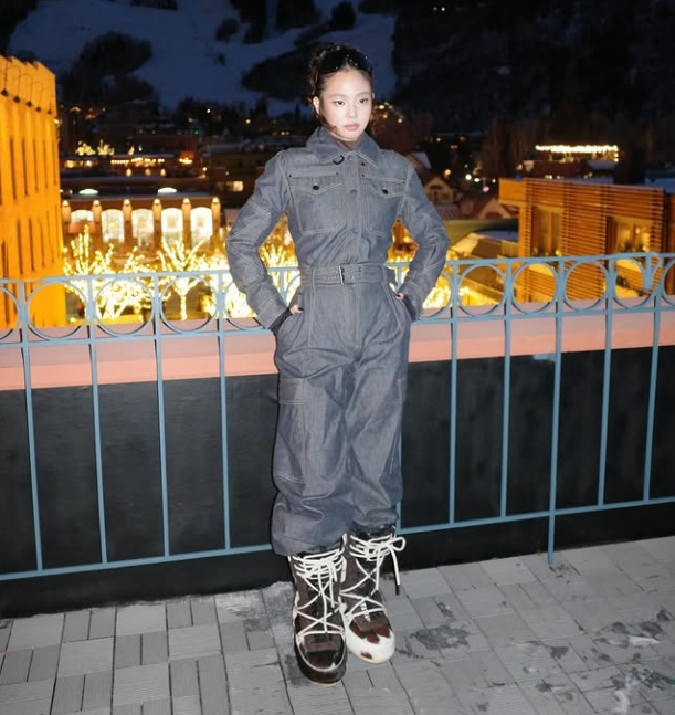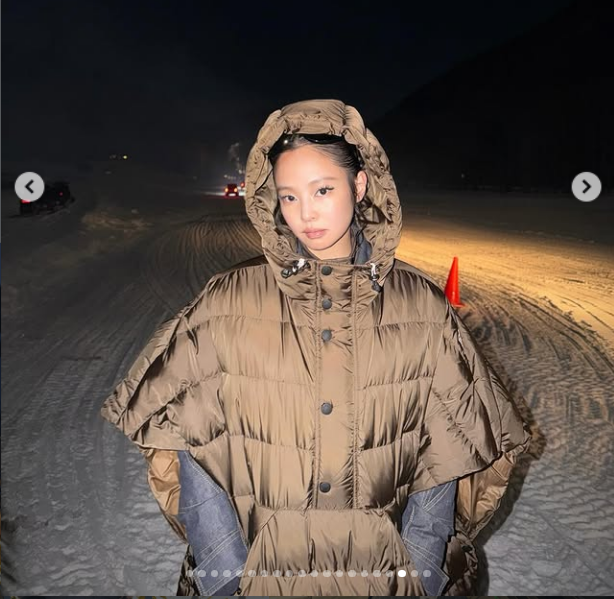 공개된 사진 속 제니는 애스펀의 특유의 도시 풍경을 배경으로 생지 데님 소재의 점프 슈트와 케이프 패딩 코트를 레이어드한 실험적인 스타일로 포즈를 취하며 패션감각을 뽐냈다.