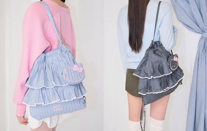 이번 협업에서 프릴백은 편안한 저지 소재와 포멀한 스트라이프 패턴 원단으로 재해석됐다. 저지 소재를 활용한 프릴백에는 빅 사이즈 헬로키티 자수를 적용해 캐주얼한 매력을 강조했다.