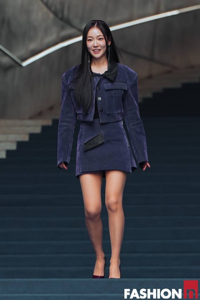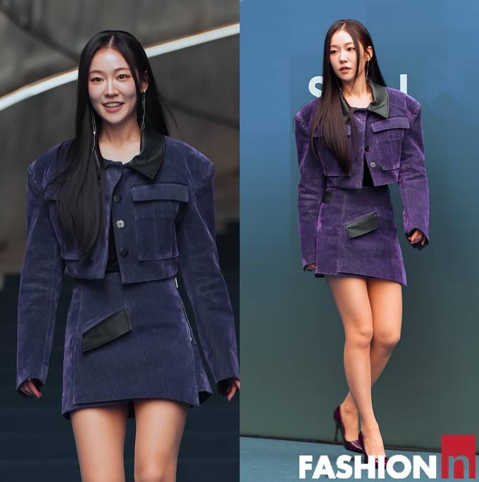 이날 송지우는 퍼플 컬러의 미니 스커트와 크롭 재킷의 투피스 슈트룩으로 단아하면서도 상큼한 미모를 발산했다.