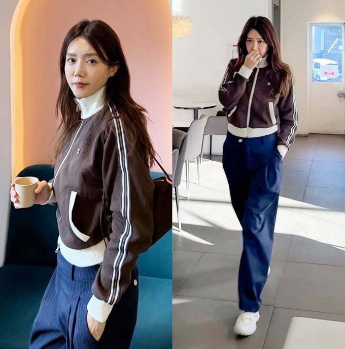 채정안, 트랙 재킷 매치가 완벽! 클래식 슈트 팬츠와 만난 블록코어 데일리룩