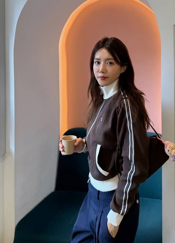 공개한 사진에서 채정안은 브라운 초코라테 트랙 재킷에 핀 스트라이프 슈트 팬츠를 매치한 데일리룩으로 일상에서의 환상적인 블록코어 스타일을 완성했다.