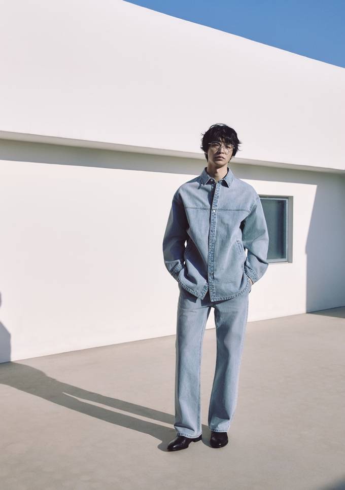 세미 오버핏 데님 셔츠와 디테일이 돋보이는 데님 팬츠의 조합으로 절제된 무드 속 남성적인 매력을 강조했다.