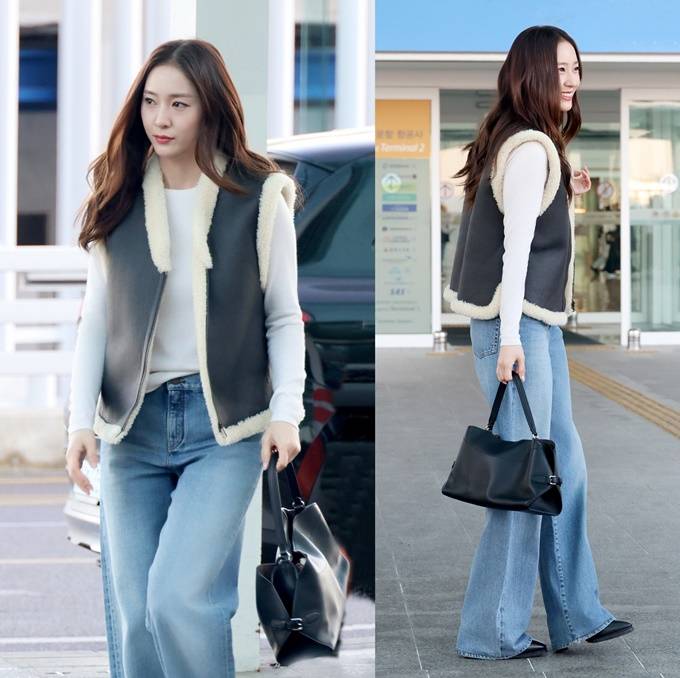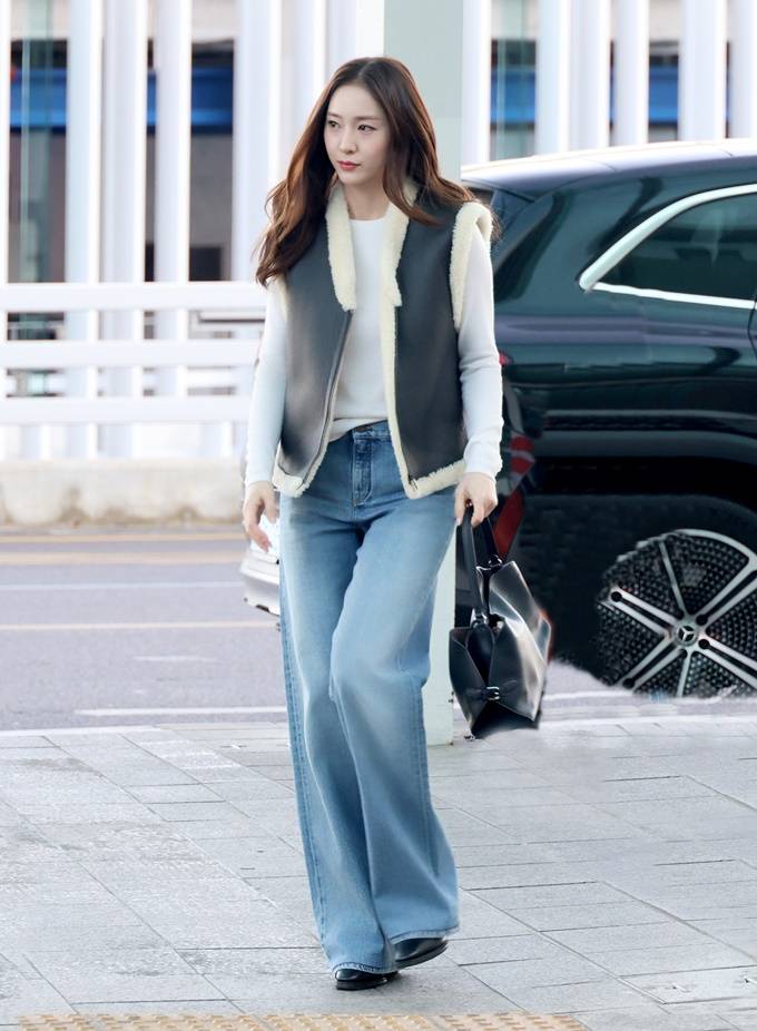 가수 겸 배우 정수정(크리스탈)이 시어링 레더 베스트로 스타일리시한 공항패션을 연출했다.
