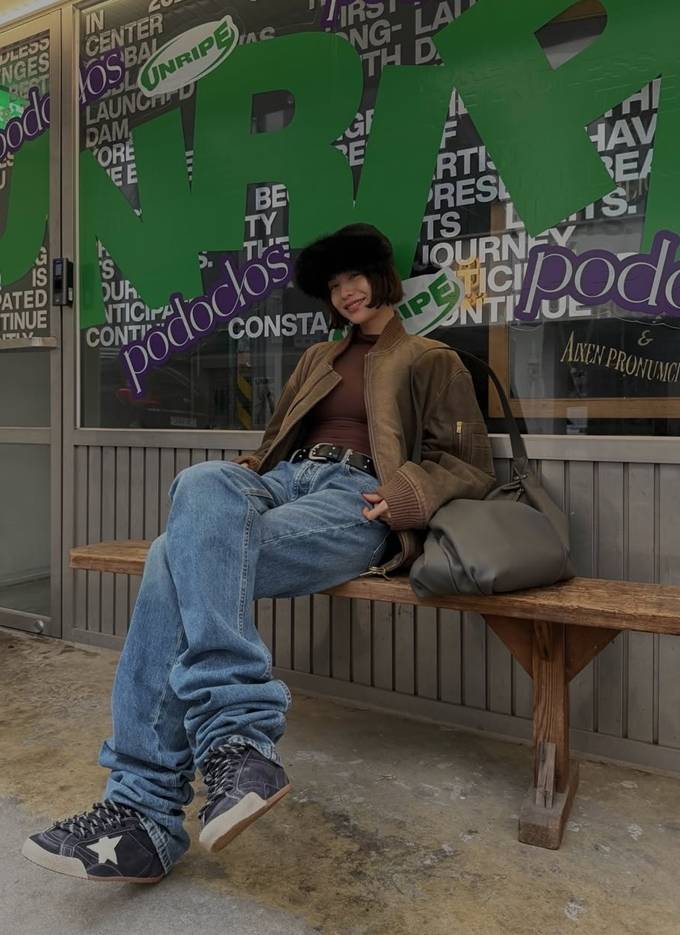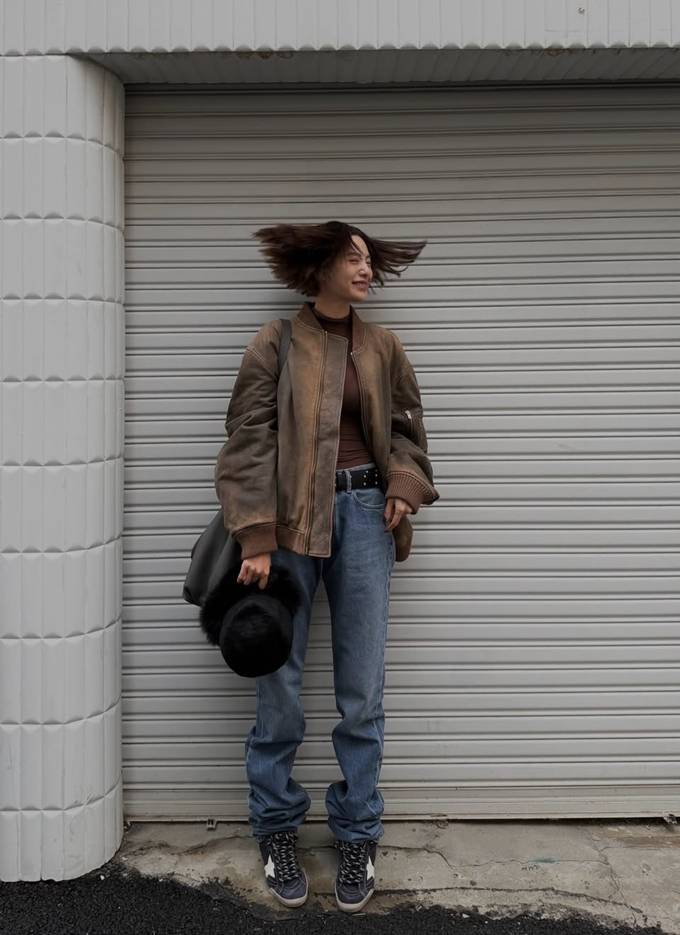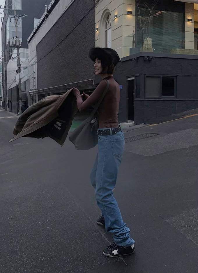 배우 나나가 샤프카 햇에 밀착 터틀넥을 입고 스웨드 재킷을 챙긴 스트릿룩으로 간절기 힙의 정석을 선보였다.
