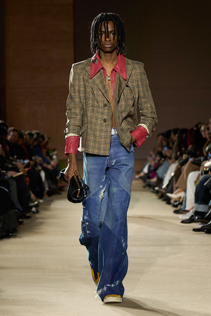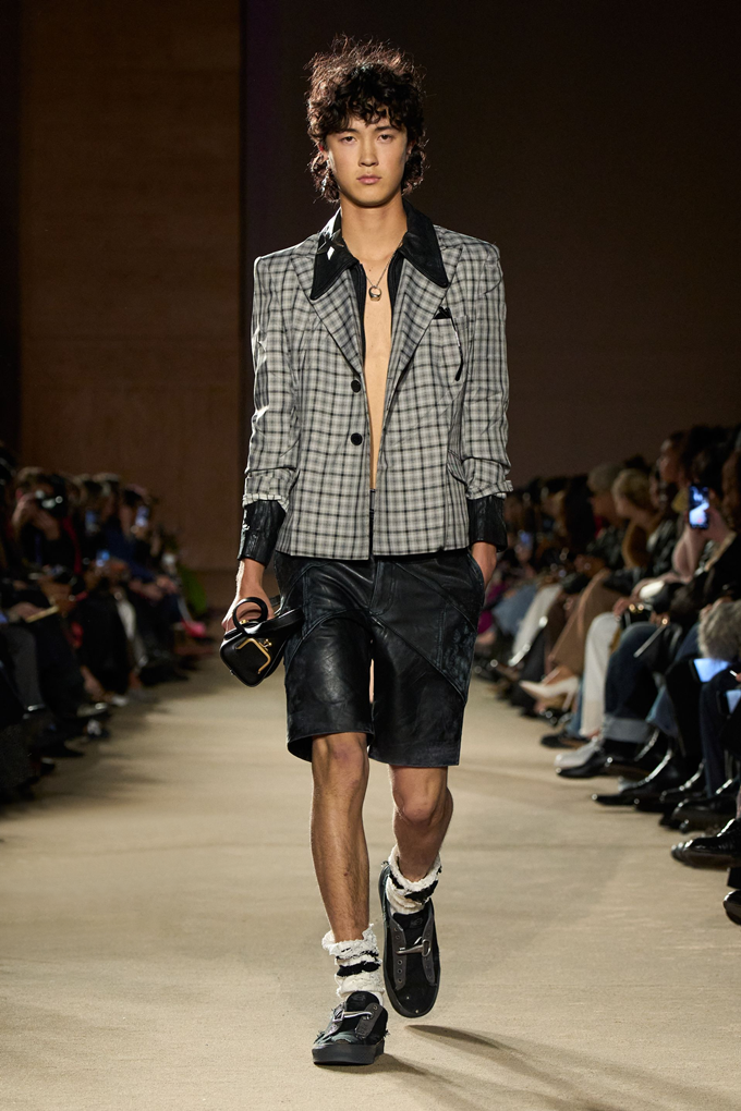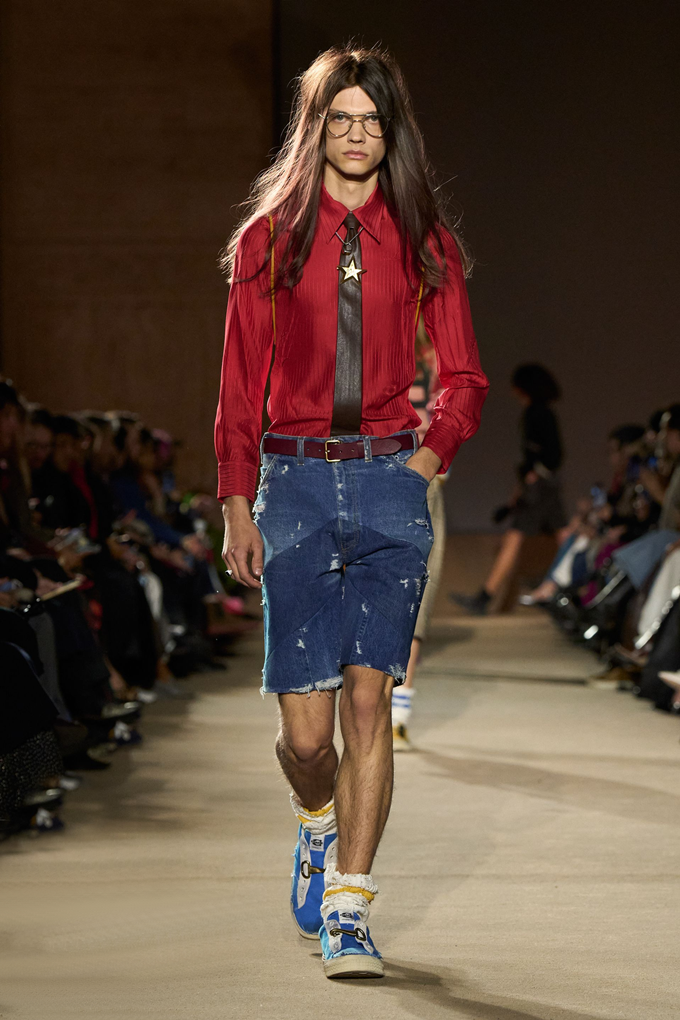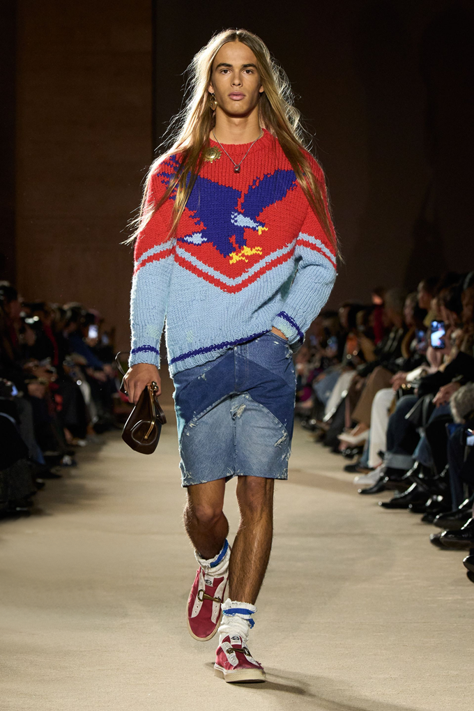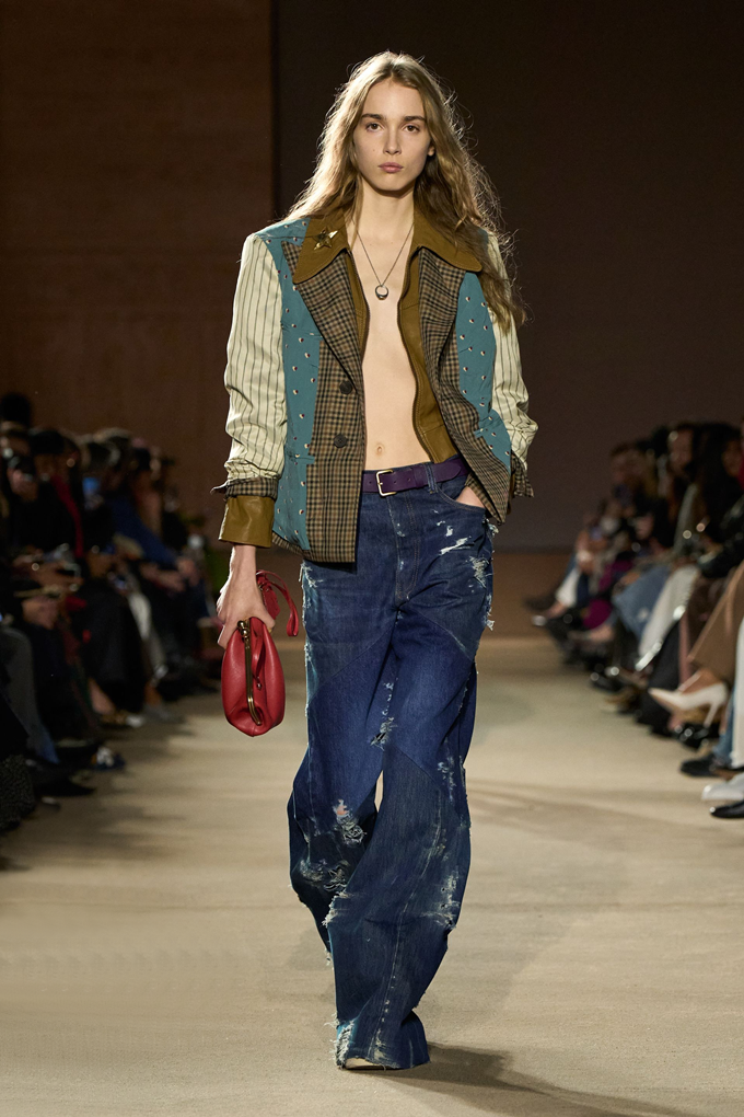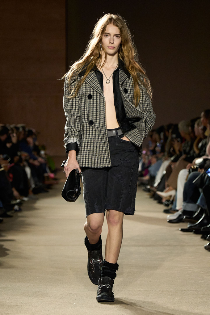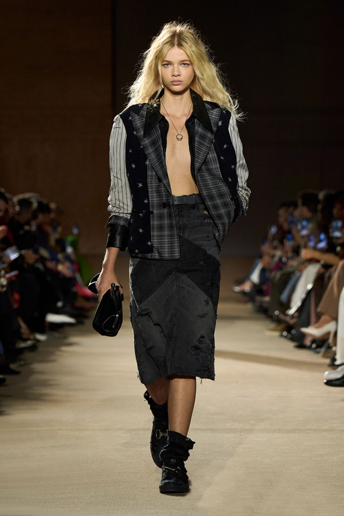 체크무늬 블레이저 안에 가죽 재킷을 레이어드한 스타일를 비롯해 미스 걸치(Miss Gulch)를 연상시키는 찢어진 레이스 밑단의 프레리 드레스, 무릎 길이 버뮤다 데님 반바지 등이 눈길을 끌었다.
