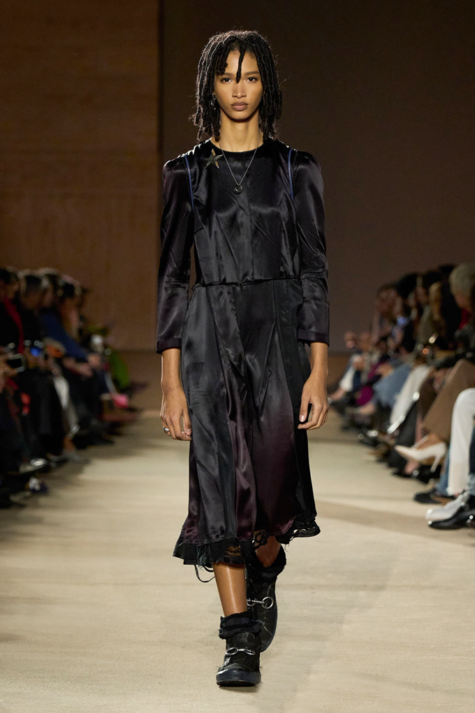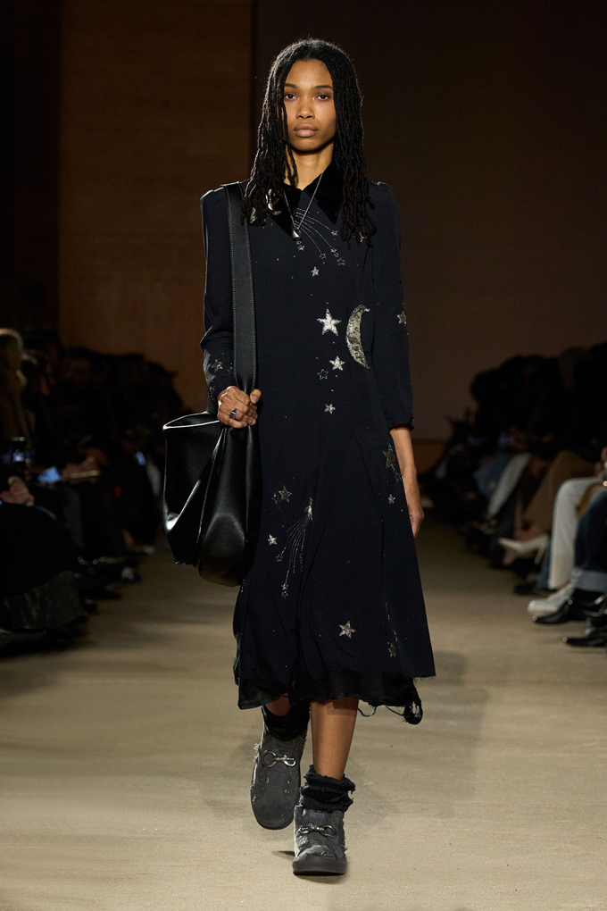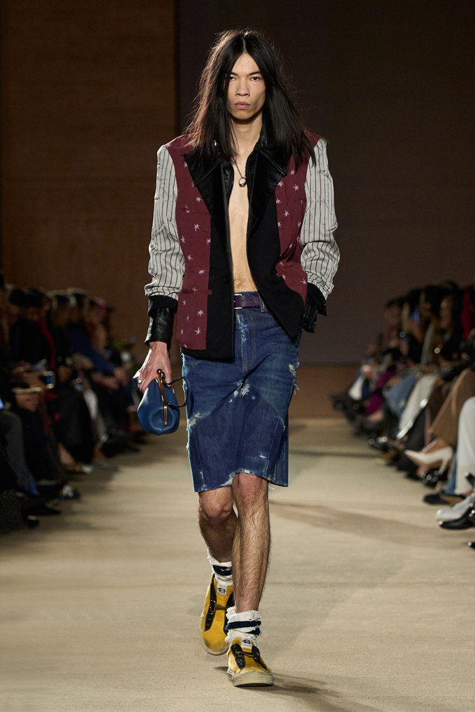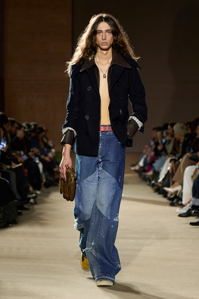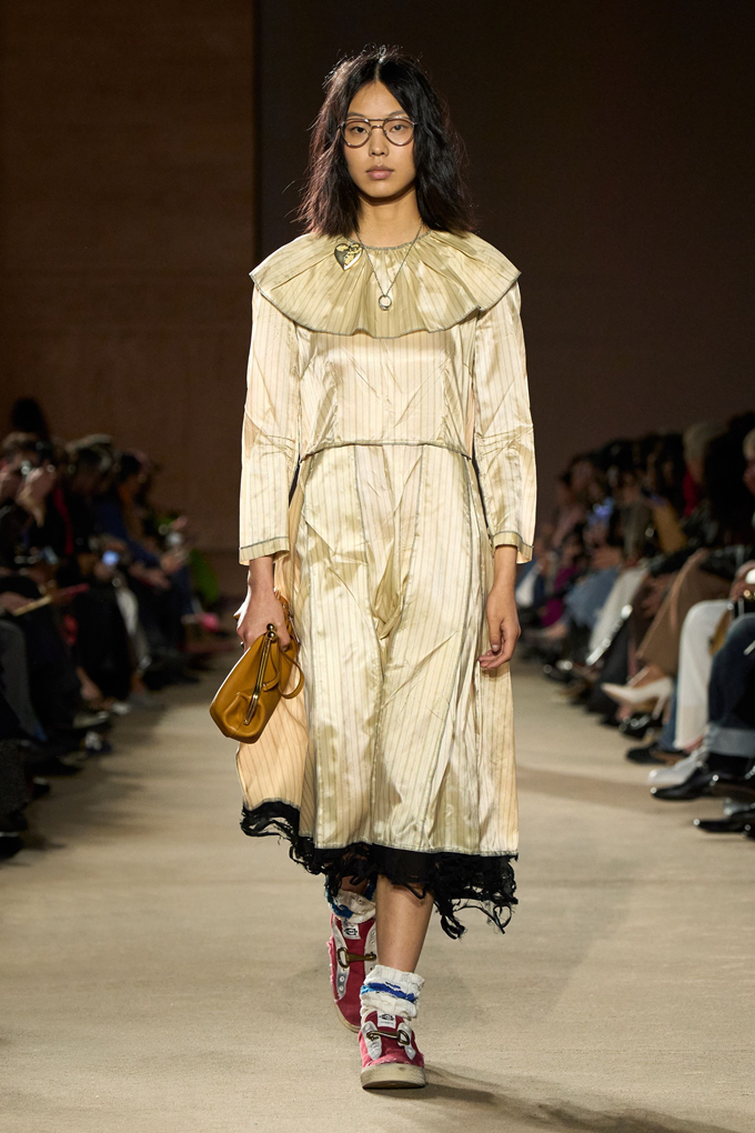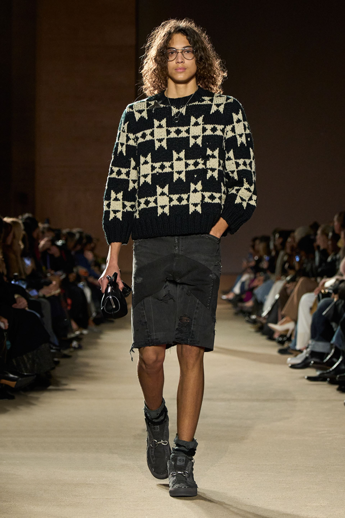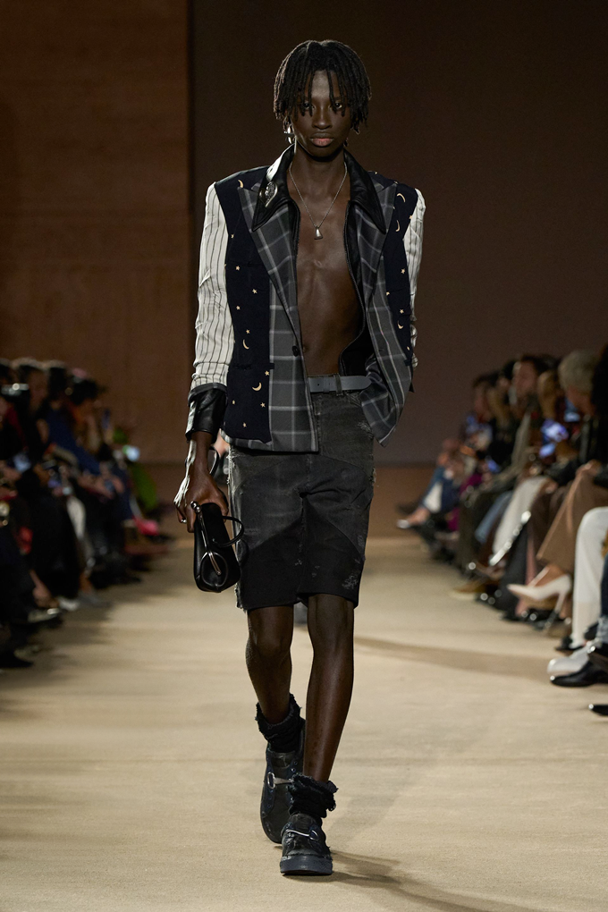 체크무늬 블레이저 안에 가죽 재킷을 레이어드한 스타일를 비롯해 미스 걸치(Miss Gulch)를 연상시키는 찢어진 레이스 밑단의 프레리 드레스, 무릎 길이 버뮤다 데님 반바지 등이 눈길을 끌었다.