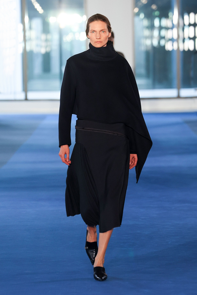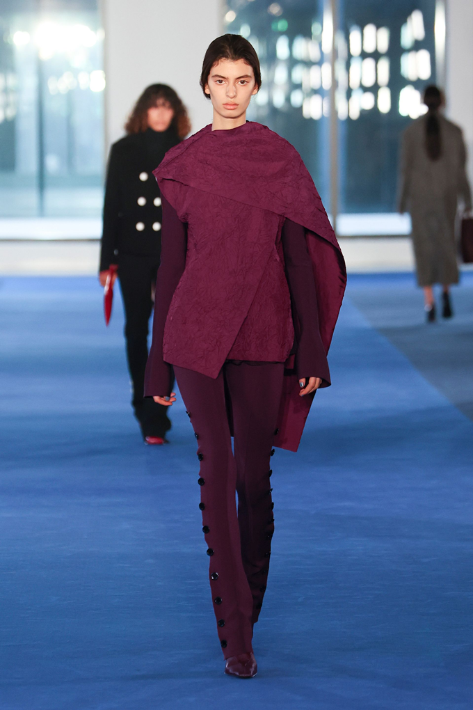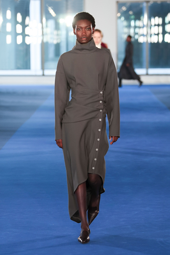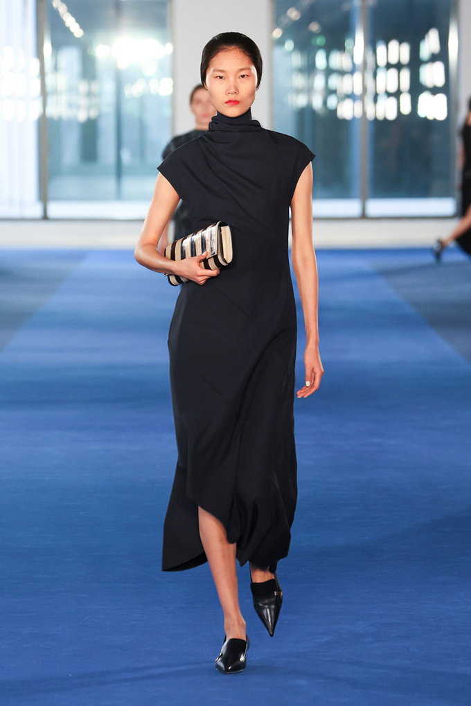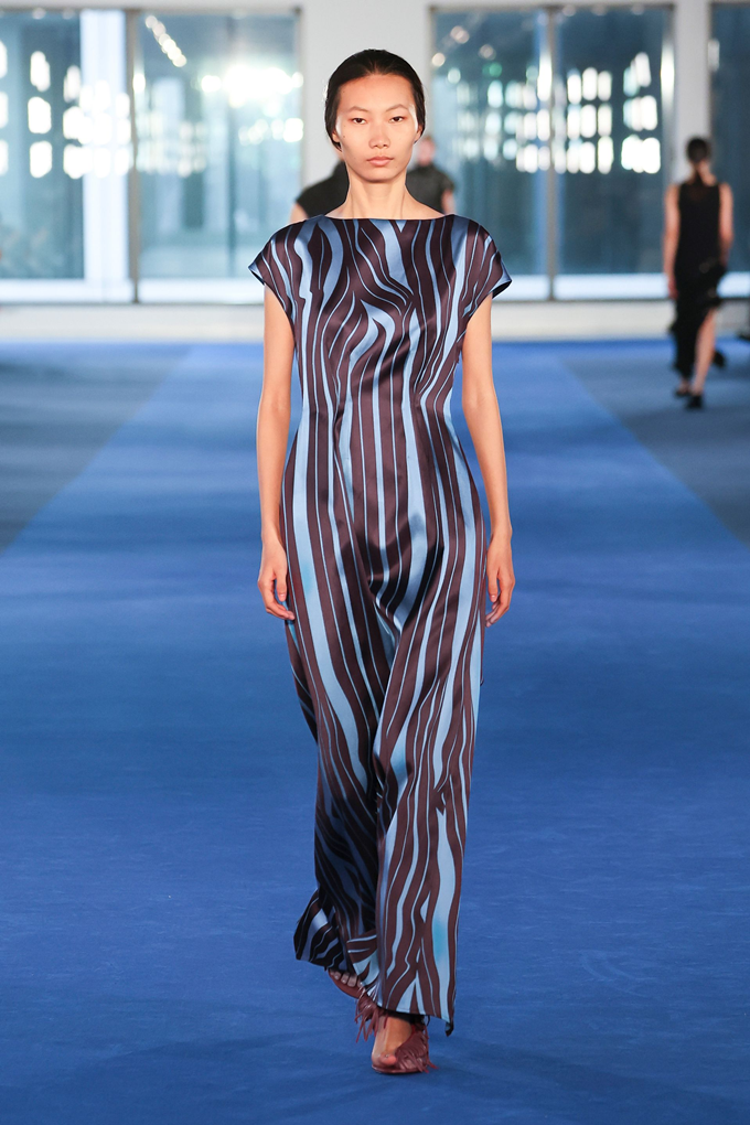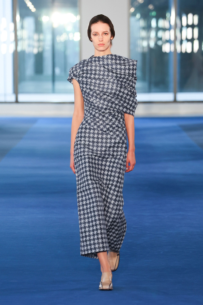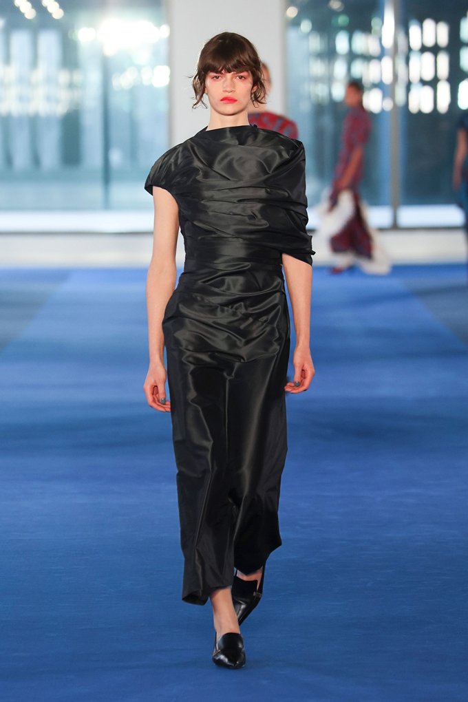 드레스는 부드럽게 구겨지고, 드레이핑 디테일로 자연스러우면서 실용적인 감각을 강조했으며 무심한 듯 역동적인 실루엣과 유연성이 조화를 이루었다.