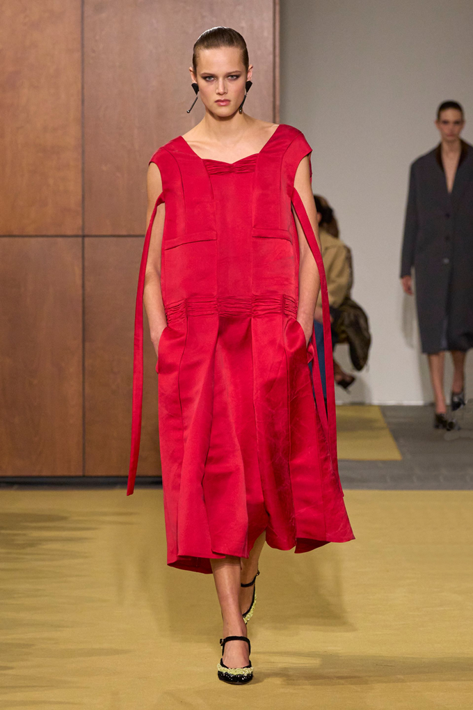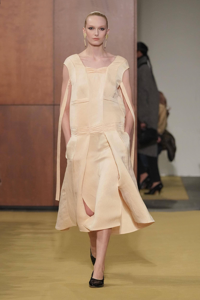 드레스의 허리선은 솔기가 풀린 채로 낮아졌고 날카로운 재단은 가죽으로 감싼 조개껍질 귀걸이, 정어리 브로치, 손으로 짠 가죽과 라피아 가방으로 포인트를 주었다.
