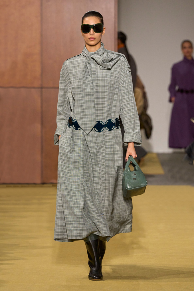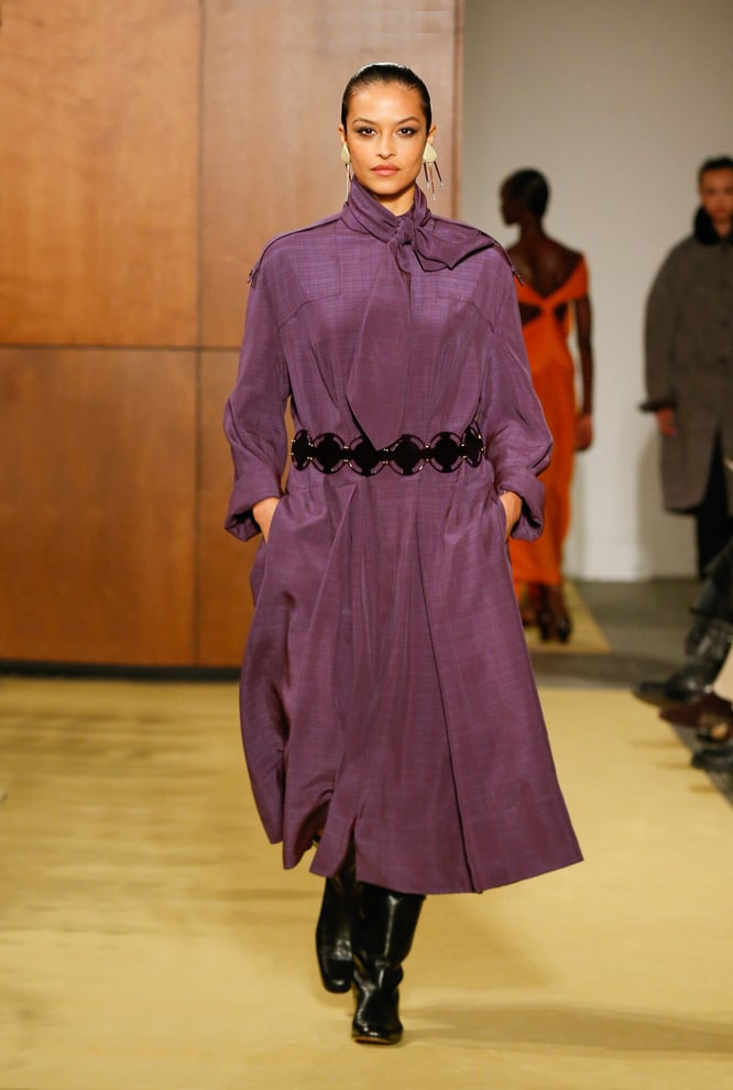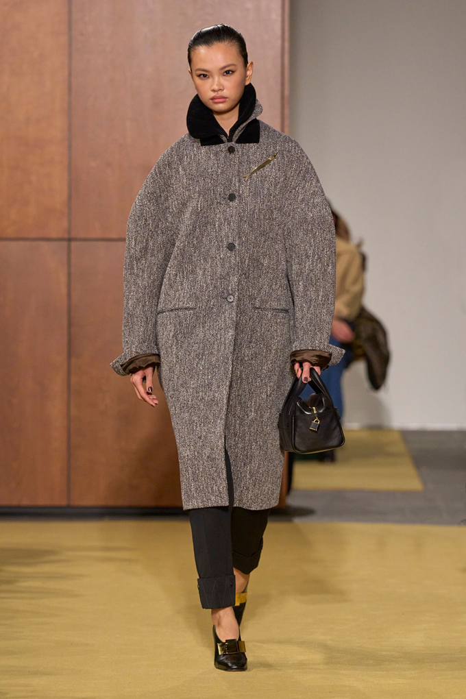 풍성한 볼륨의 코트를 걸친 모습은 컬렉션에 위엄을 더했고, 허리선이 낮은 스커트 등이 눈길을 사로잡았다.