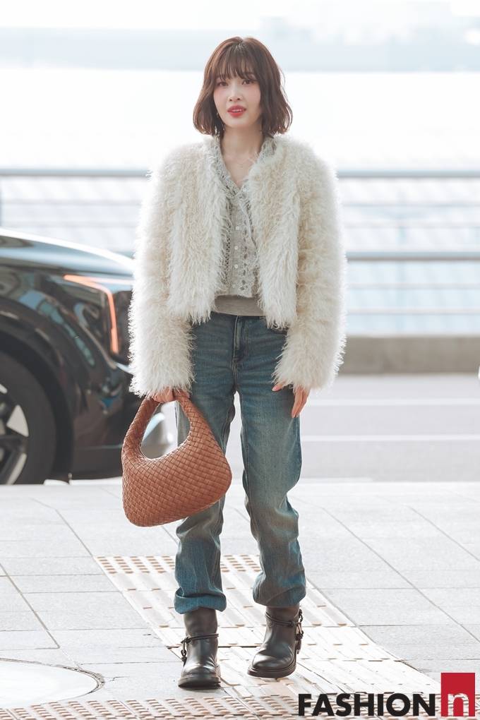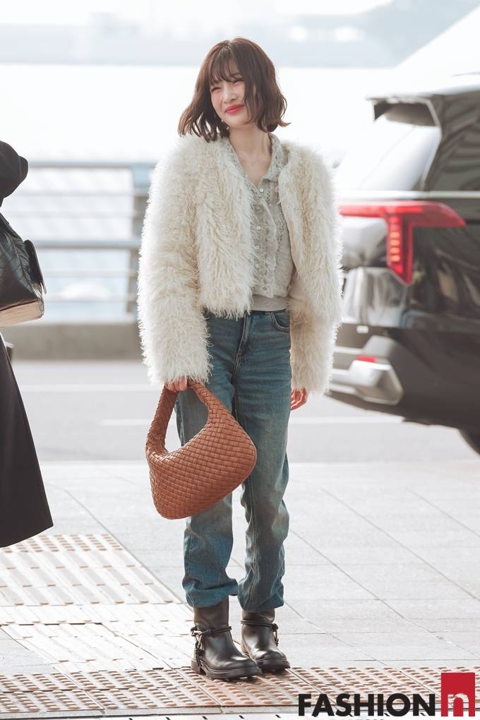 이날 조이는 단발 헤어 스타일에 복슬복슬한 퍼 볼륨이 돋보이는 볼레로 재킷에 데님 팬츠를 매치한 출국룩으로 러블리하면서도 힙한 스타일을 서보였다.