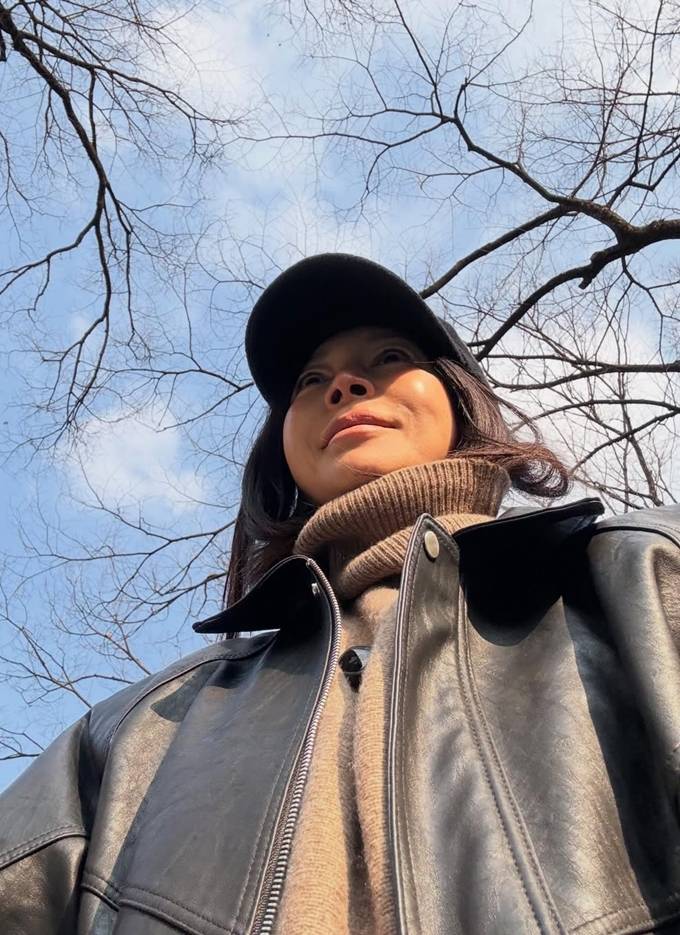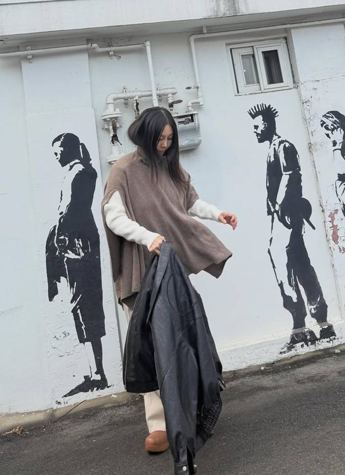 배우 황신혜가 레더 재킷을 벗은 케이프 톱 하나로 감각적인 봄 데일리룩을 완성했다.