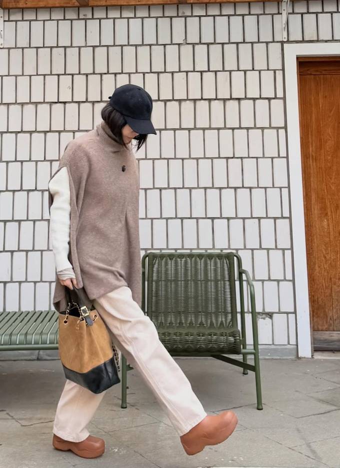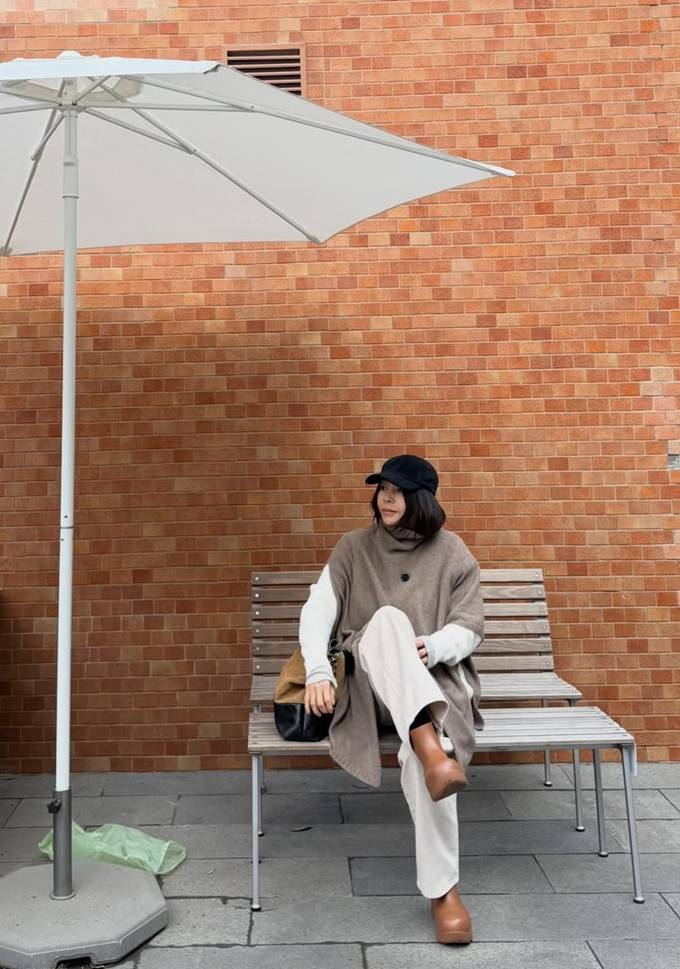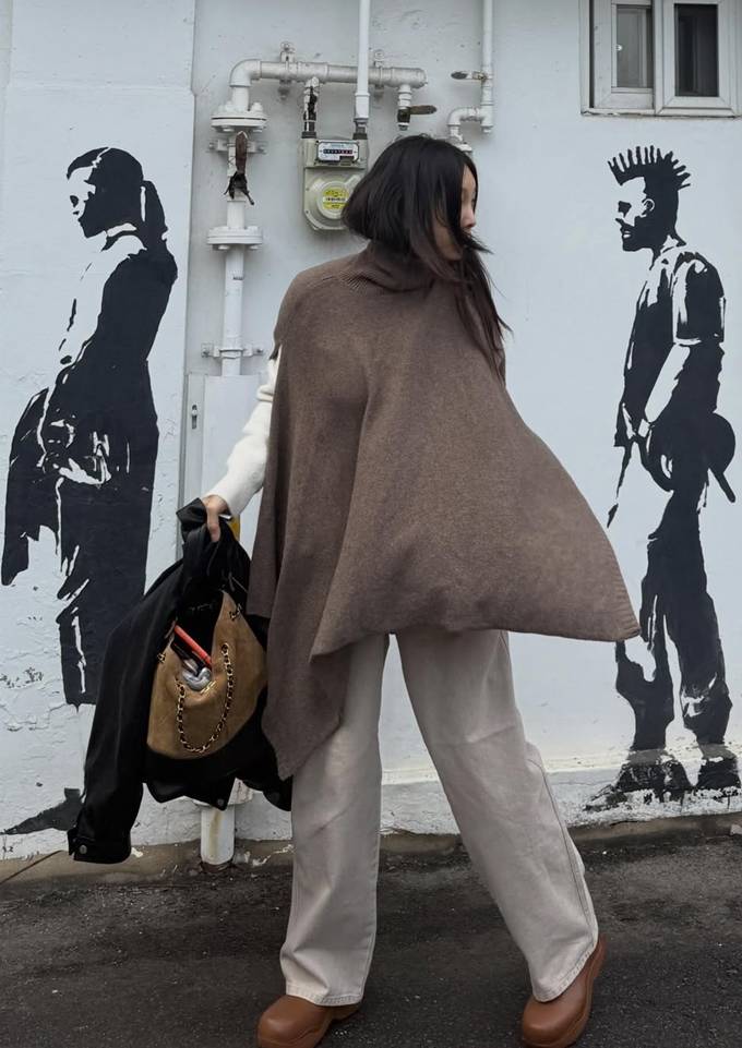 복잡한 레이어드 없이도 단 하나의 아이템으로 체형을 부드럽게 감싸며 우아한 분위기를 배가시켰으며, 와이드한 소매 라인으로 마치 망토를 두른 듯한 드라마틱한 실루엣을 완성했다.