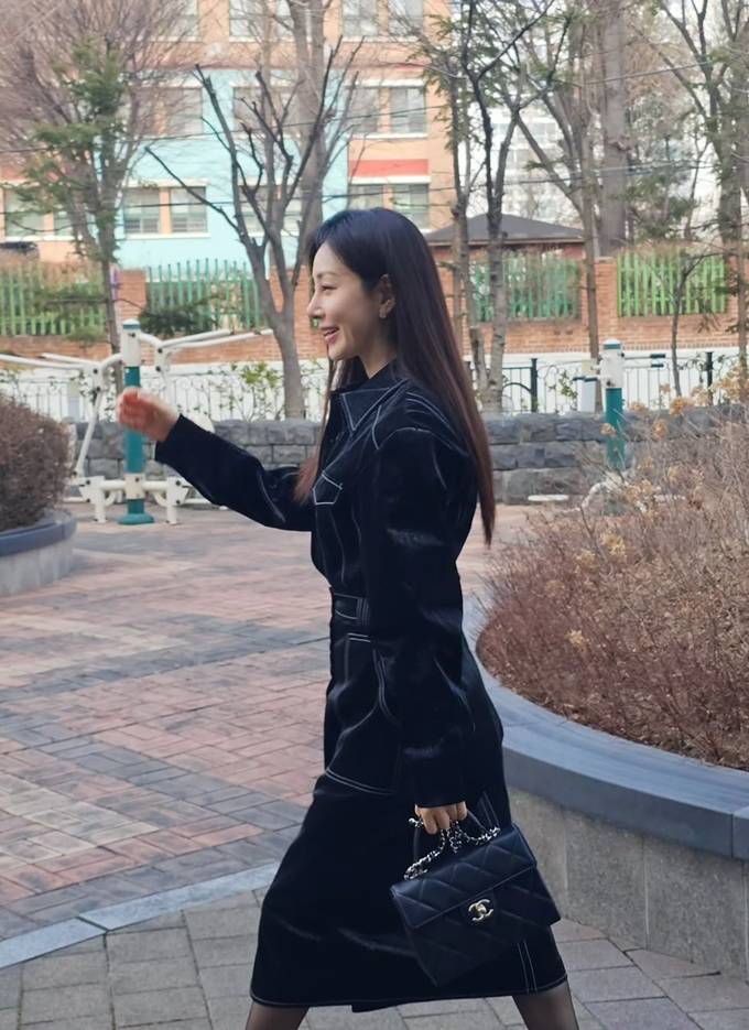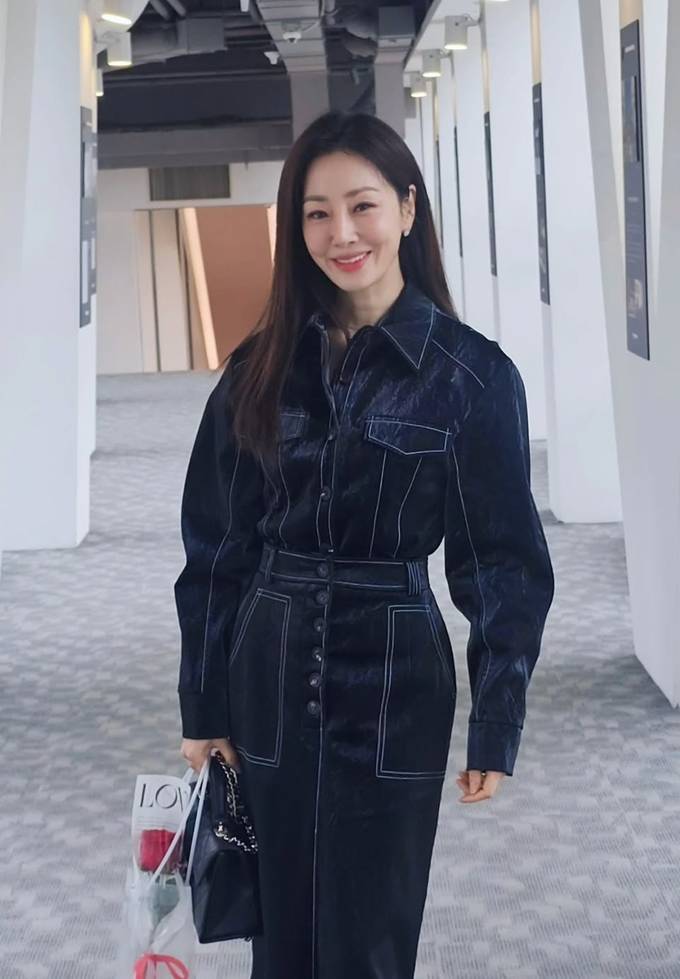 배우 오나라가 블랙 레더 셔츠와 스커트 셋업의 레더룩으로 신부 보다 더 예쁜 민폐 하객룩을 선보였다.