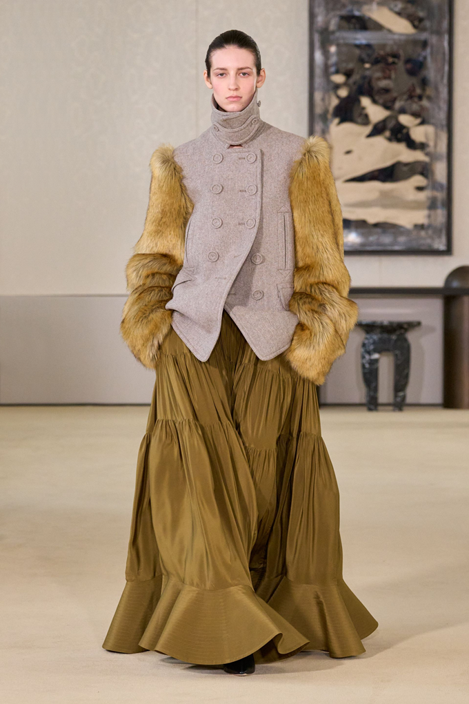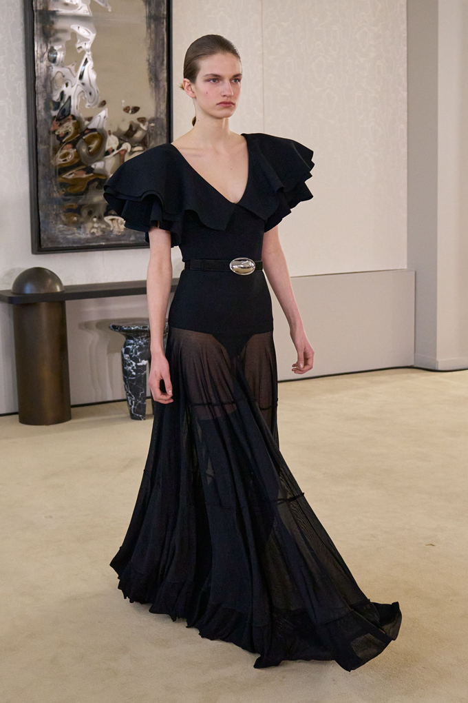 전통 플라멩코 스커트의 아름다운 곡선을 연상시키는 티어드 스커트는 볼륨감과 구조감을 주입, 코쿤 형태의 피코트와 극적인 대비를 이루며 컬렉션을 지배했다.
