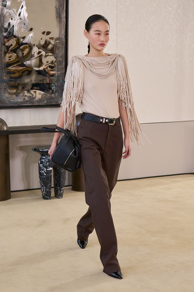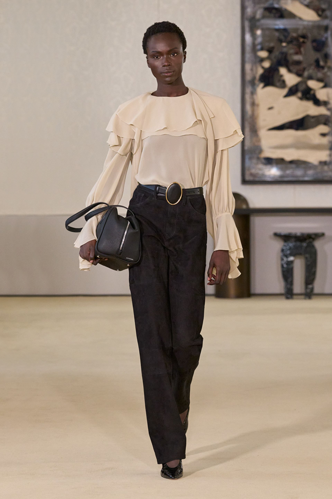 최고급 스웨이드 소재의 카펜터 팬츠는 작업복의 전형적인 형태를 한층 고급스럽게 재해석하고 클래식한 터틀넥은 후드티로 변형되며 눈길을 끌었다.
