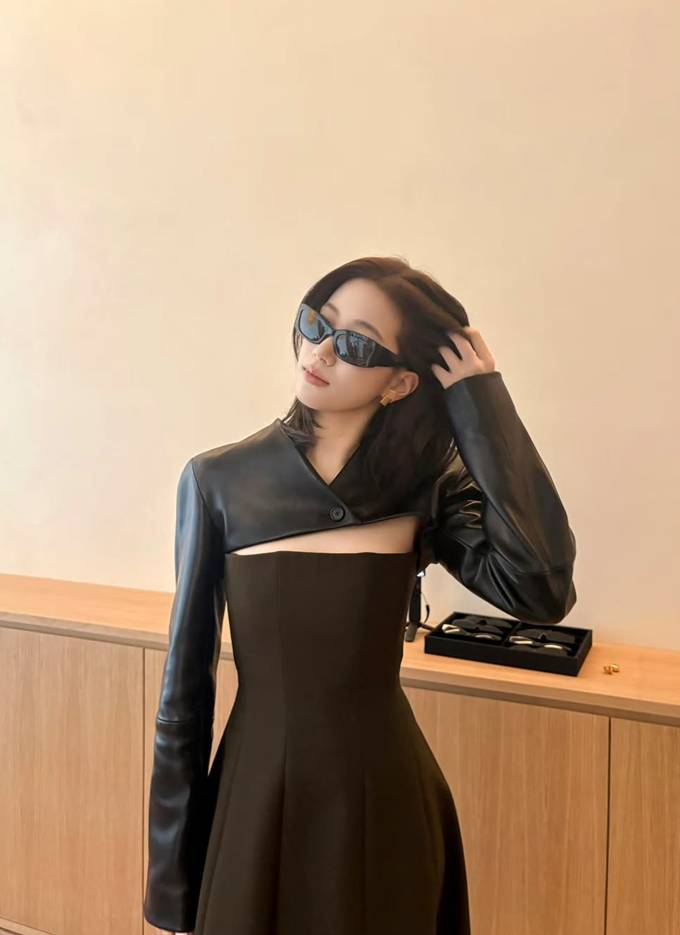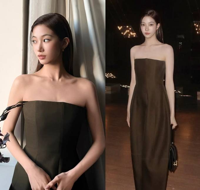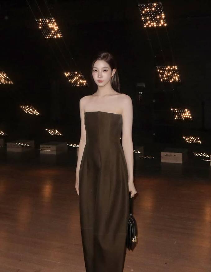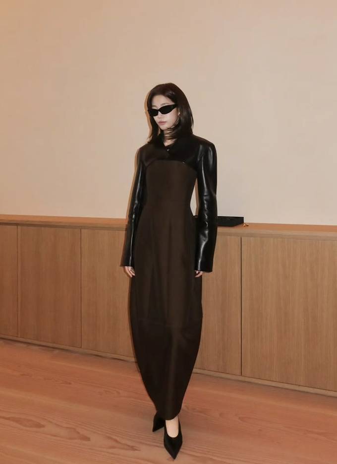 공개한 사진에서 구조적인 라인이 강조된 스트랩리스 브라운 롱 드레스룩으로 미니멀하면서도 우아한 분위기를 자아냈다.