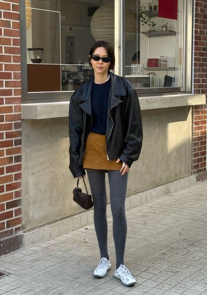 김나영, 이젠 미니 스커트와 타이즈 꺼낼 때! 짧아진 스커트에 가죽 재킷 봄 데일리룩