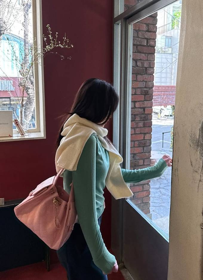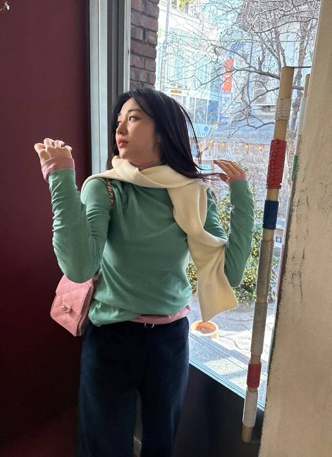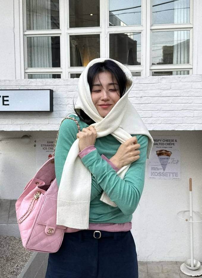 박하선은 핑크 이너에 그린 컬러의 티셔츠를 레이어드하고 화이트 니트 스웨터를 어깨와 머리에 두른 컬러풀한 스타일로 봄 외출 패션을 완성했다.