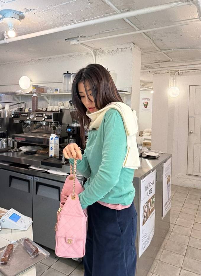 박하선, 스타일에 봄이 왔네! 핑크·그린·화이트 봄내음 솔솔 숄더 로빙 레이어드룩