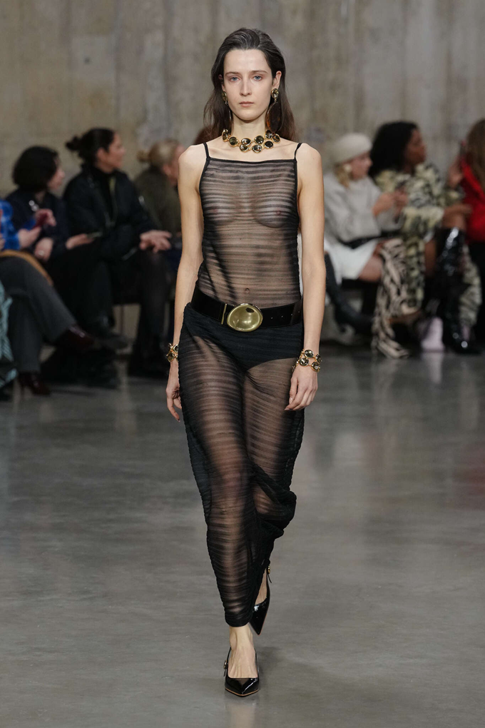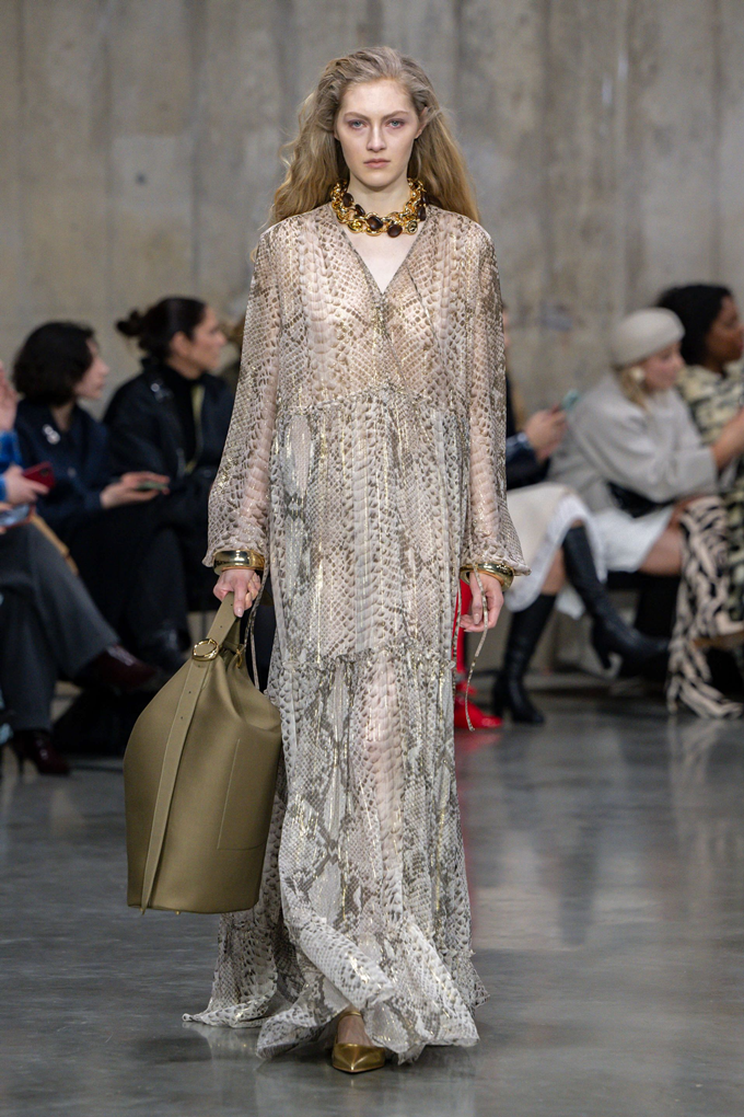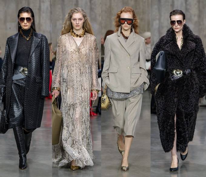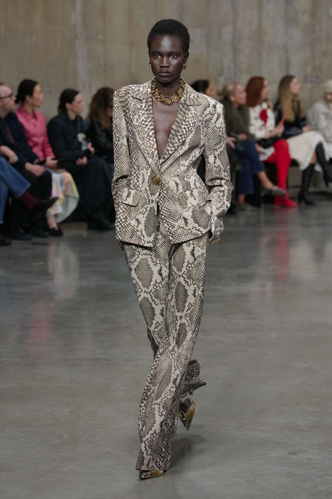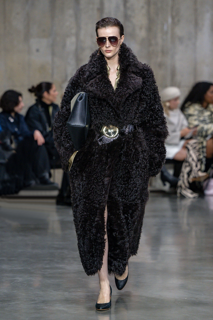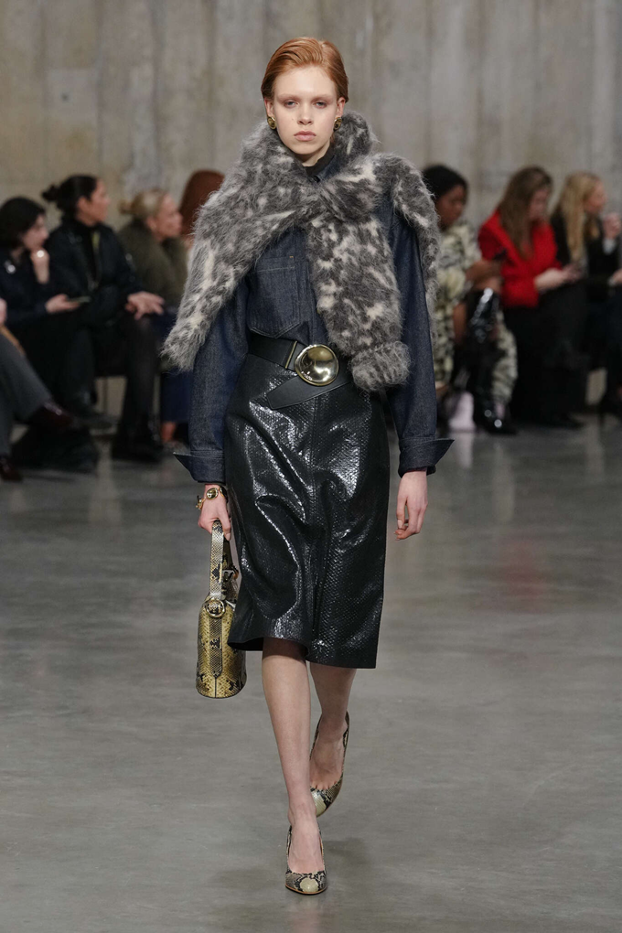 니트와 스커트 정장 앞면의 깃털 장식, 금빛 벨트 버클과 굵직한 팔찌 등 세심한 디테일에 심혈을 기울였고 원단, 모피, 실을 사용하여 열망을 담았다.