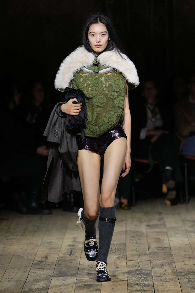 레이스, 튤, 실크, 새틴, 섬세한 꽃무늬, 반짝이는 장식 등 가벼운 소재들이 두꺼운 울, 나일론, 스웨이드, 시어링 소재와 어우러지며 존재감을 드러냈다.