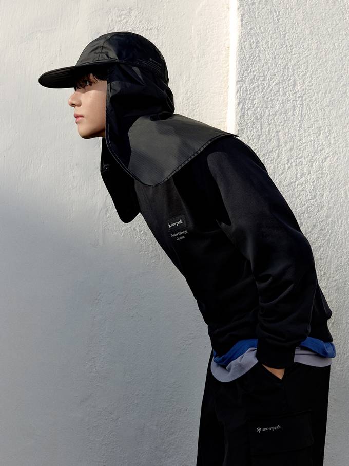 뷔는 아웃도어 브랜드 스노우피크 어패럴과 함께한 2026년 봄 컬렉션 화보에서 아웃도어 웨어가 일상 속 장면으로 자연스럽게 스며드는 순간을 담아냈다.
