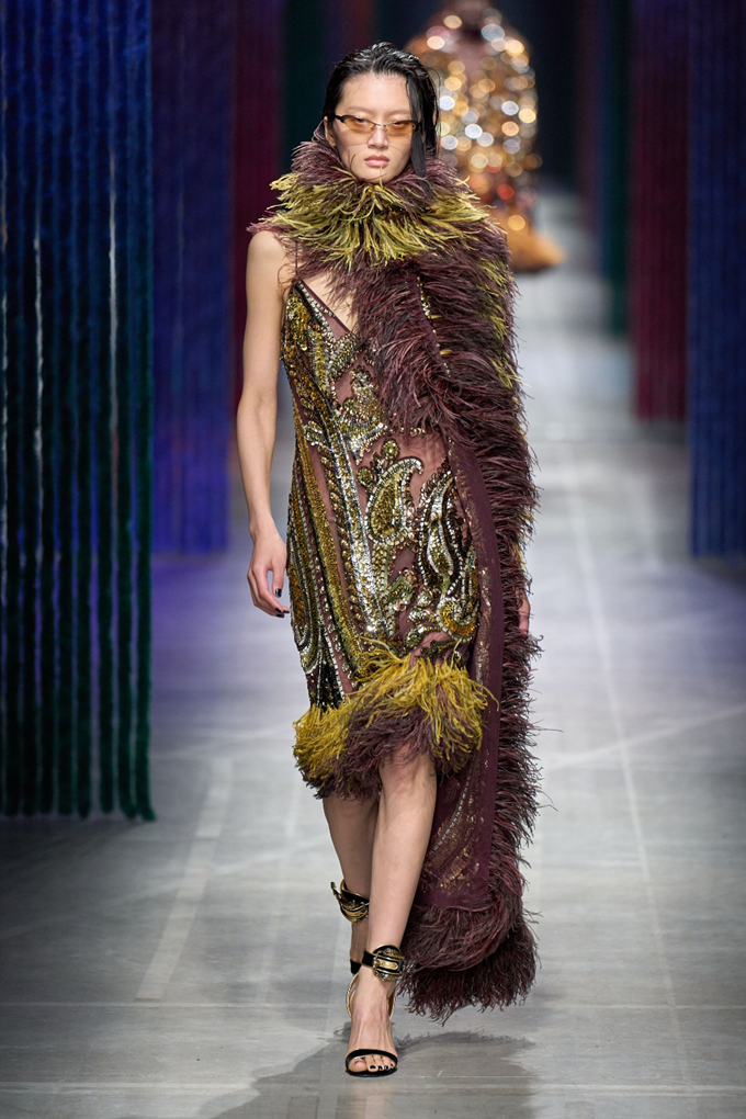 타탄 체크와 트롱프뢰유(trompe-l’oeil) 기법을 사용한 스카프 프린트의 대비, 중세 동물 문양에서 연상시키는 모티프와 문장 디테일, 페이즐리 패턴, 예상치 못한 깃털 장식이 더해진 슬림한 테일러링이 조화를 이룬다.