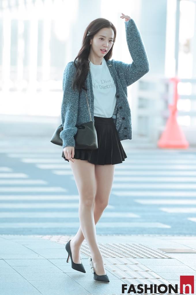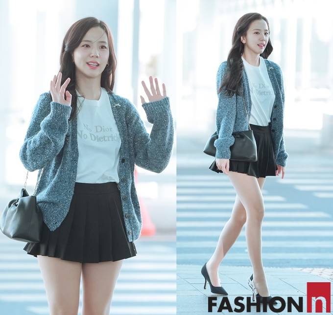 이날 지수는 짧은 미니 플리츠 스커트에 화이트 티셔츠와 블루 트위드 카디건을 걸친 출국 스타일로 청순하면서도 발랄한 공항 프레피룩을 선보였다.