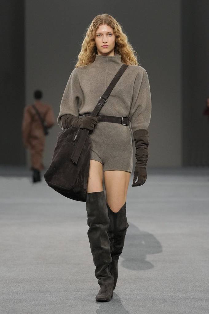 힙라인을 강조한 절개 디테일의 캐시미어 맥시 스커트와 중세 궁정의 소년 시종인 페이지 보이(page boy)에서 영감을 받은 스웨이드 소재의 튜닉, 유연하게 밀착되는 울트라 플랫 미드-싸이 부츠, 메탈 리벳을 연속적으로 장식한 디테일, 그리고 누벅(nubuck) 숄더 패치를 더한 코트 등 이른바 ‘암흑 시대(Dark Age)’의 디자인은 동시대적인 감각으로 표현했다.