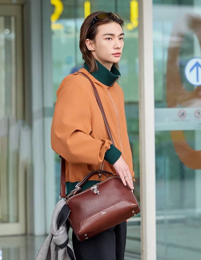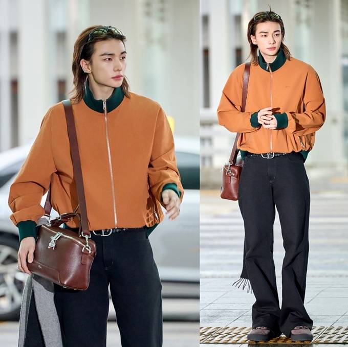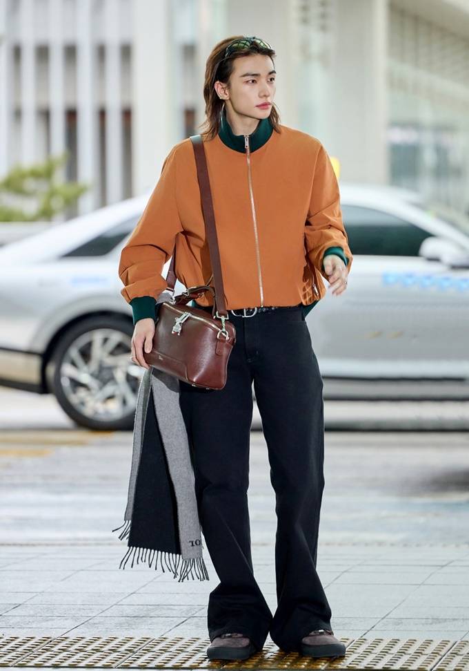 그룹 스트레이 키즈(Stray Kids) 현진이 오렌지 블루종 재킷으로 세련된 공항패션을 연출했다.