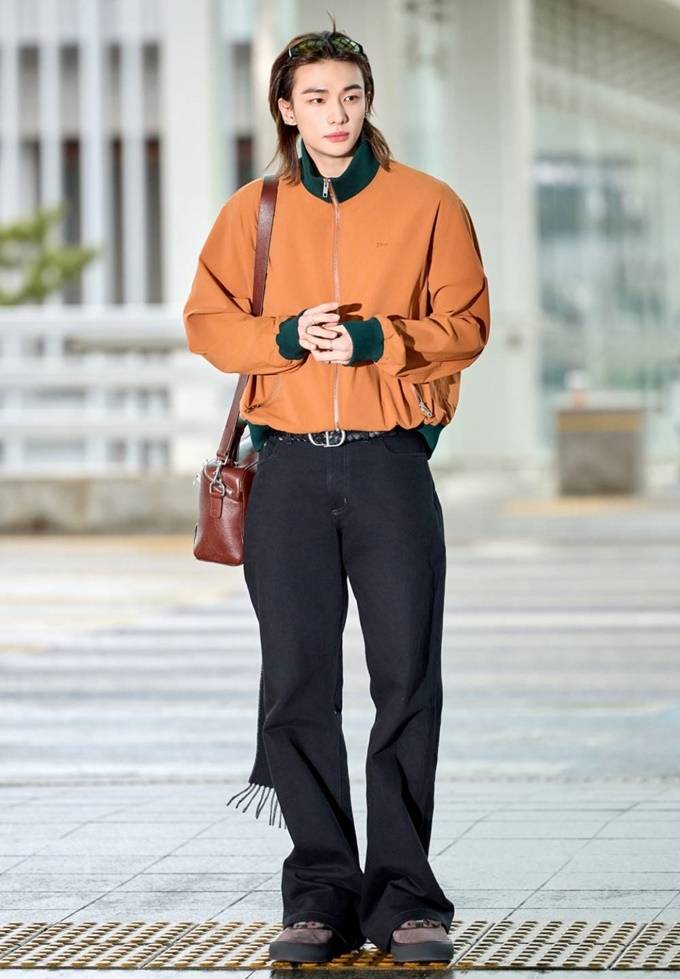 그룹 스트레이 키즈(Stray Kids) 현진이 오렌지 블루종 재킷으로 세련된 공항패션을 연출했다.