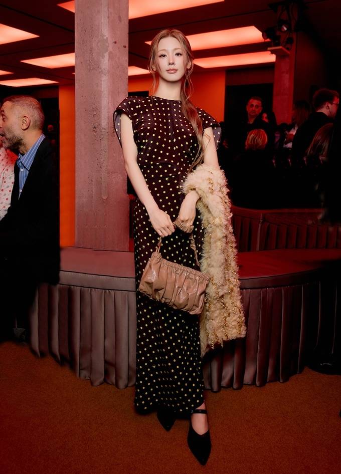 이날 마르니 쇼에 참석한 미연은 도트 무늬의 민소매 맥시 원피스와 여기에 모피 스톨을 매치한 복고풍의 패션위크 스타일을 완성하며 글로벌 패션 관계자와 미디어의 주목을 받았다.