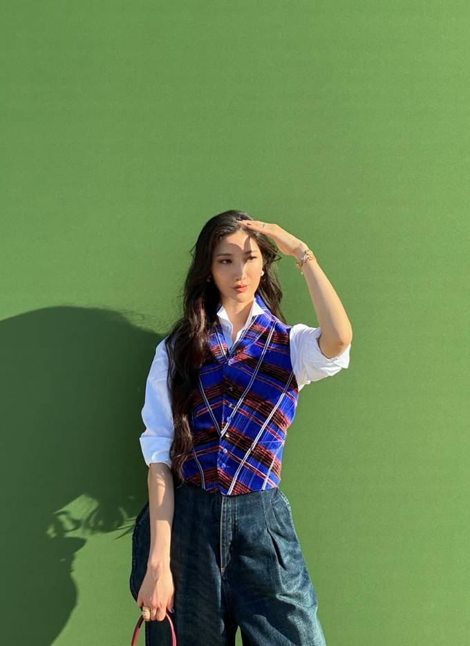 하의로는 볼륨감 있는 와이드 데님 팬츠를 선택해 트렌디함을 더했다. 하이웨이스트 디자인과 여유 있는 실루엣이 상체의 단정한 레이어드와 대비를 이루며 세련된 균형을 완성했다.