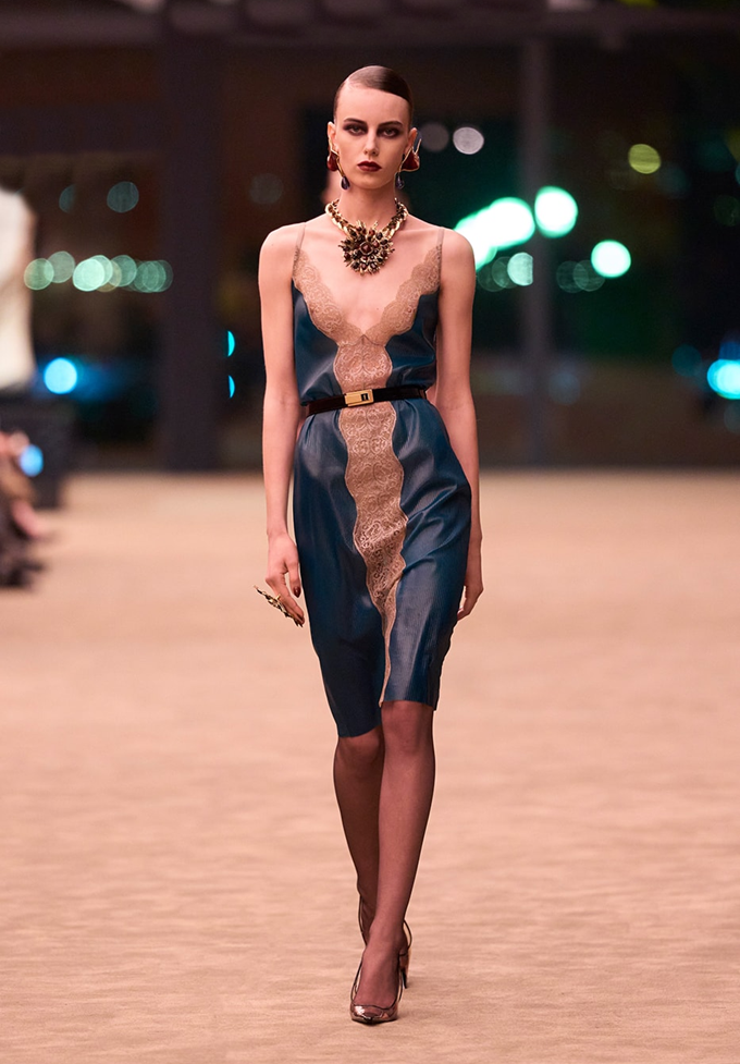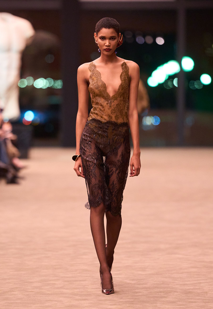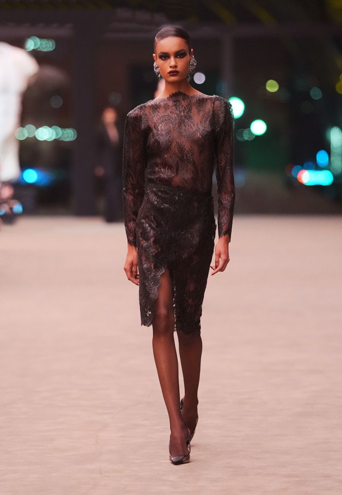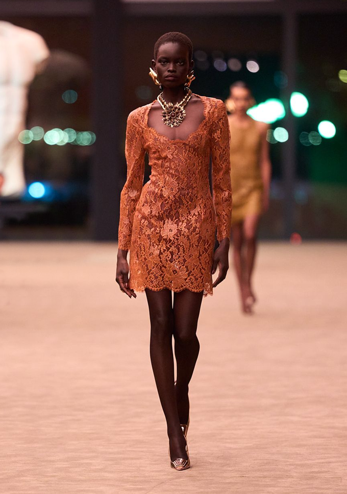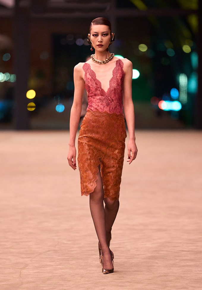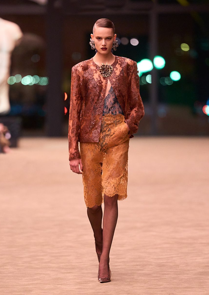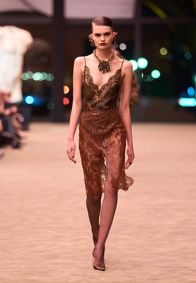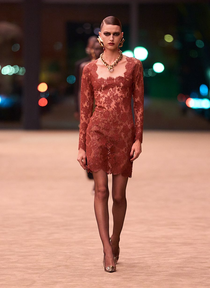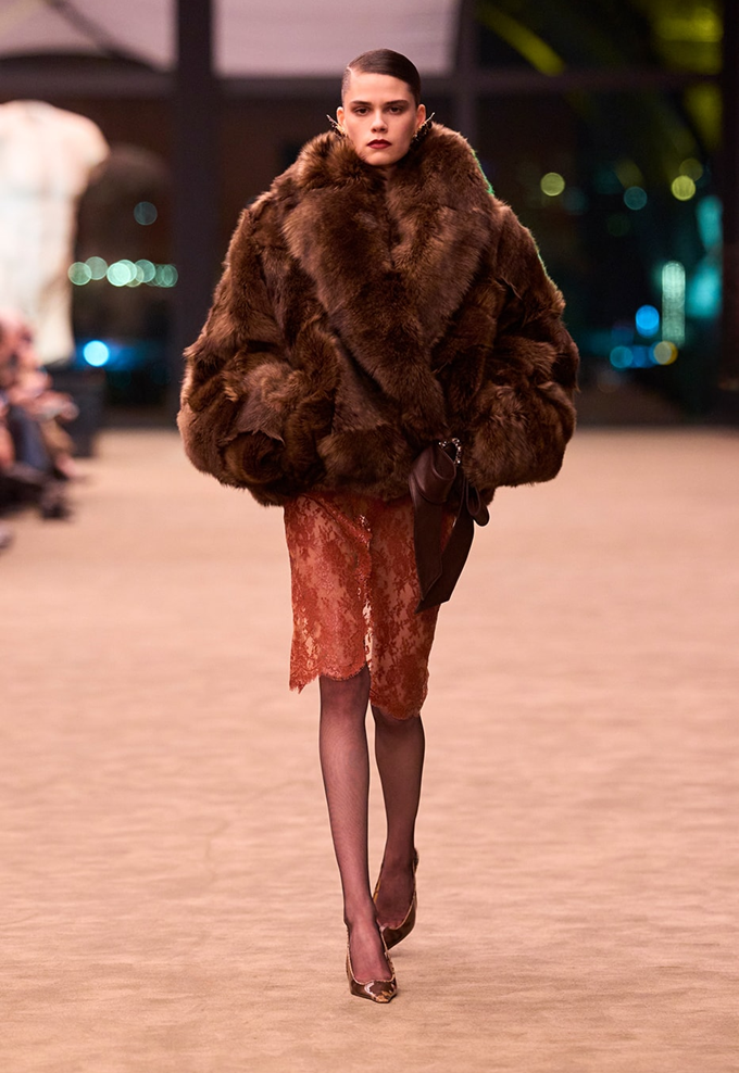 붉은색, 오렌지색, 갈색 등 흙빛 계열의 시스루 레이스 드레스와 스커트는 커다란 모피 코트와 매치되거나 굵직한 액세서리로 균형을 맞췄다.