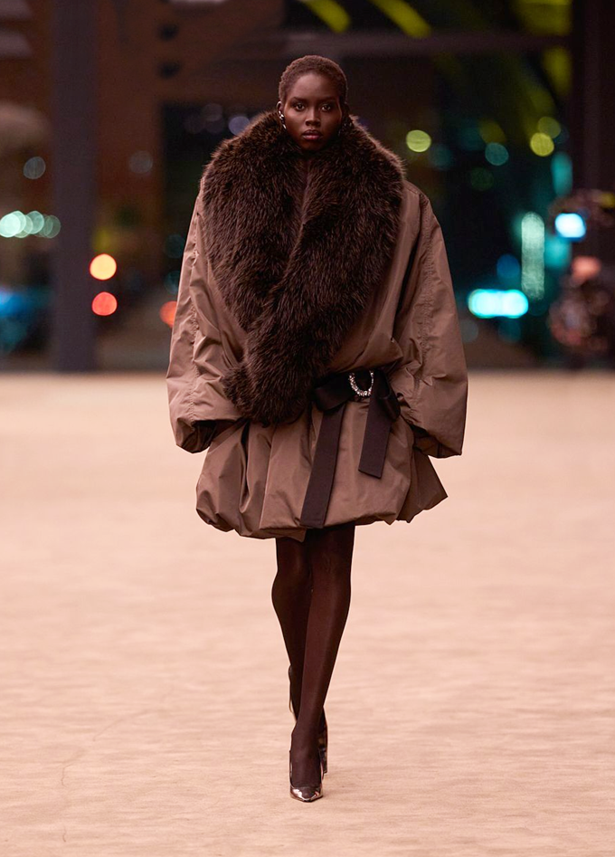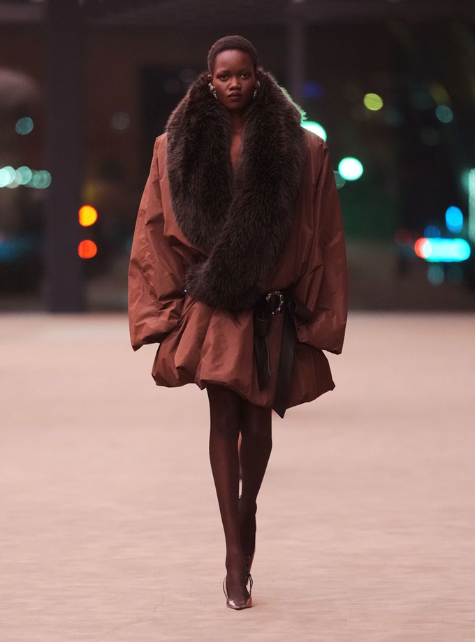 오버사이즈 모피 코트는 과장된 비율로 모델들을 감싸며 드라마틱한 분위기를 더했고, 브라운, 블랙, 딥 버건디 톤의 절제된 색상 팔레트와 조화를 이루었다.