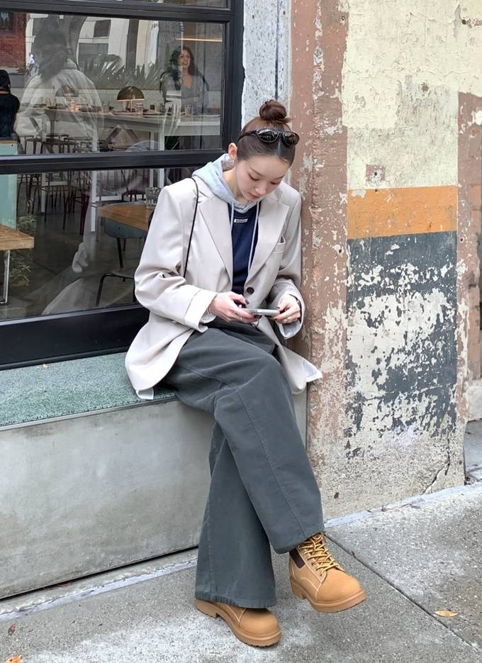 여기에 볼드한 워커 스타일의 브라운 부츠를 더해 전체 룩에 안정감 있는 포인트를 더했다.