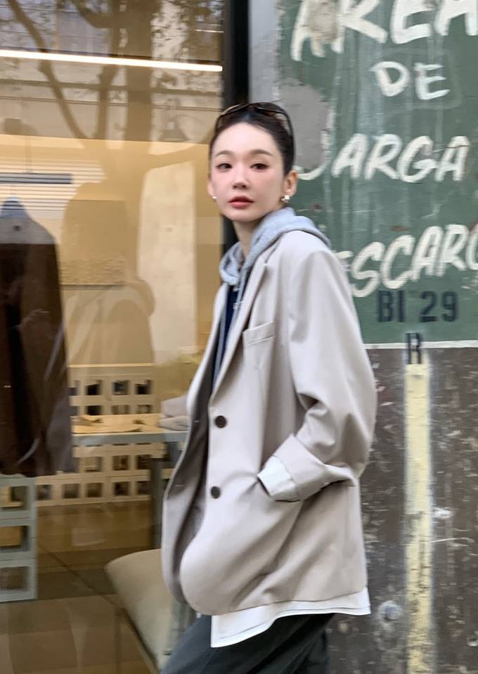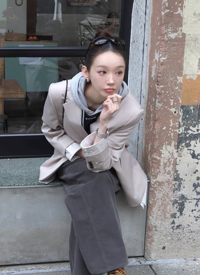 단정한 테일러드 재킷에 캐주얼한 후디를 레이어드해 포멀과 캐주얼을 자연스럽게 믹스한 스타일이 돋보인다.