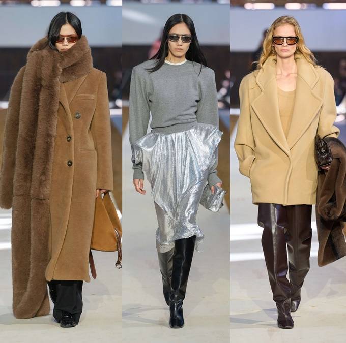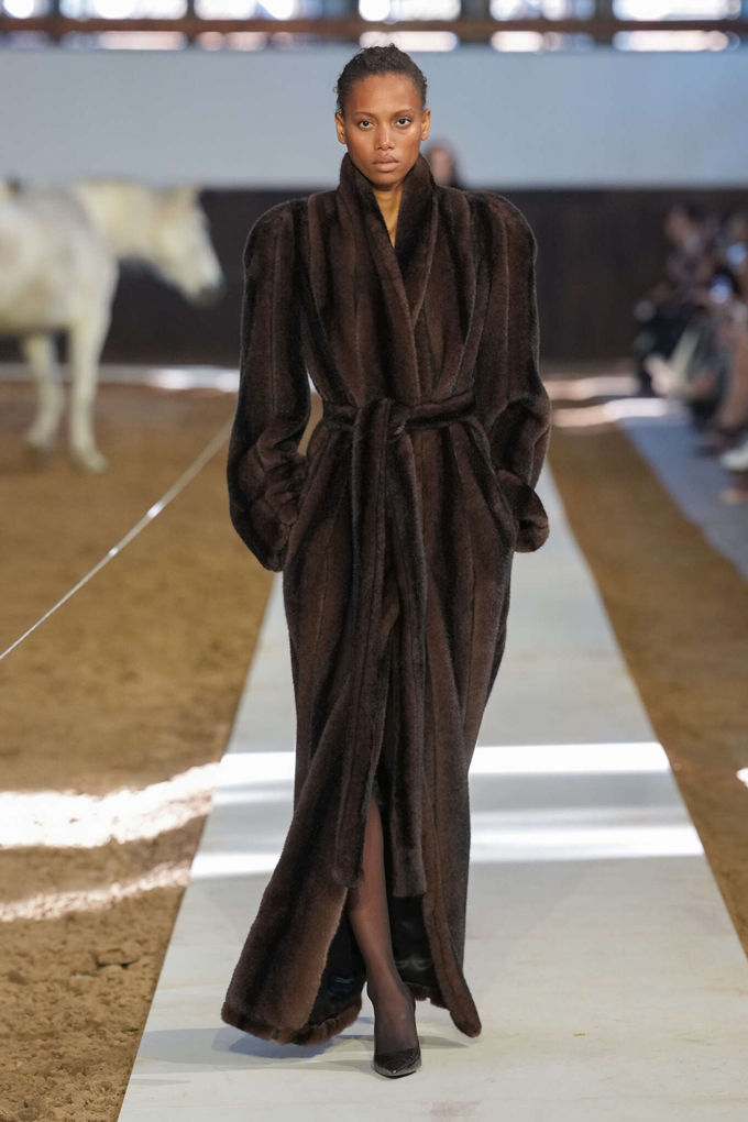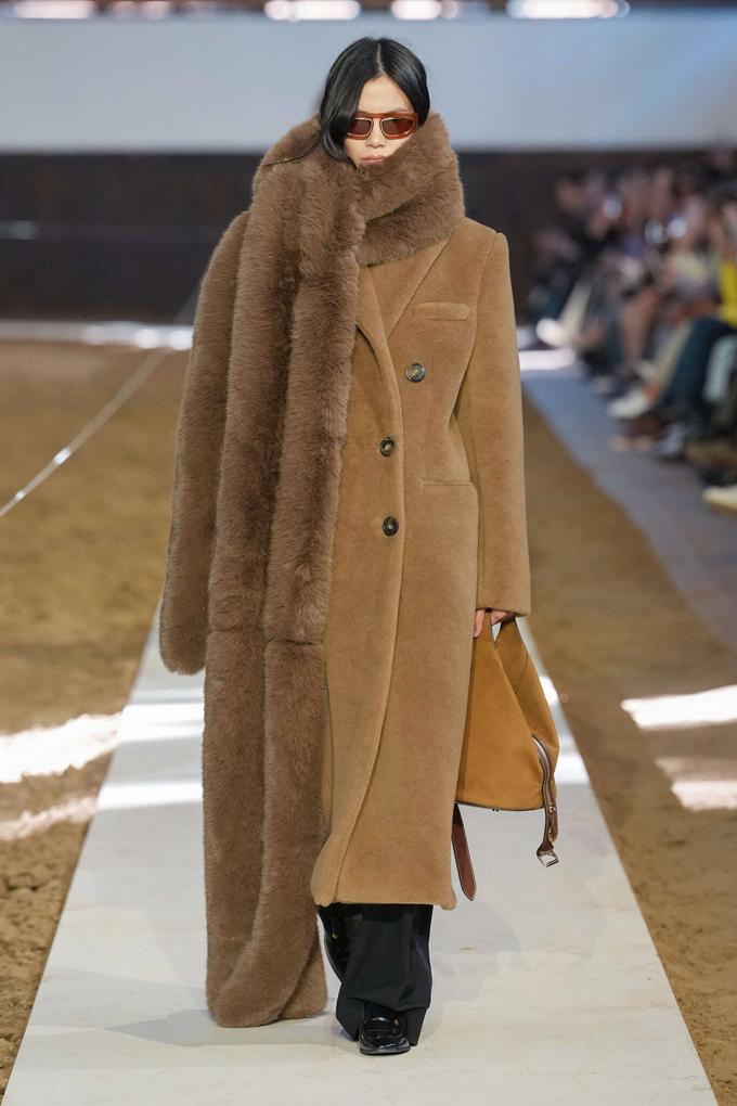 인조 모피 장식은 블레이저 가장자리, 코트 밑단 안감, 소매 마감 등 쇼 전반에 걸쳐 반복적으로 사용되었다.