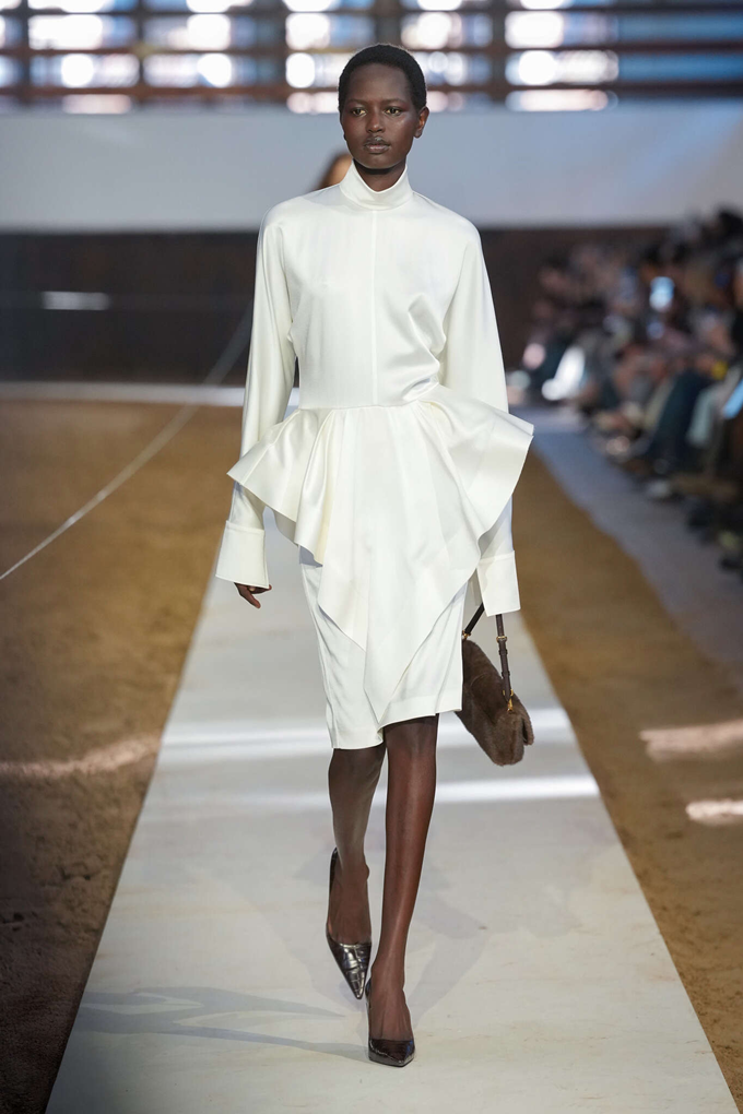 컬렉션의 핵심은 어깨선이 강조된 부드러운 테일러링, 편안한 착용감의 비즈니스 수트, 과하지 않으면서도 은은하게 빛나는 새틴 이브닝 드레스 등 시그니처룩을 비롯해 승마 모티브의 실루엣과 디테일을 반영한 아이템이 선보여졌다.