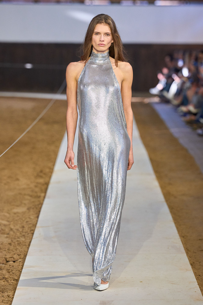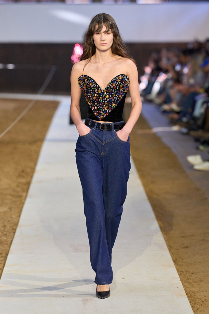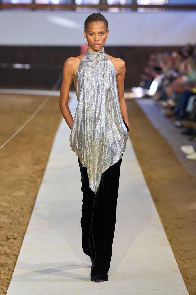 승마 부츠와 스터럽 팬츠를 프레피 스타일의 스웻 셔츠와 매치하고, 시퀸으로 뒤덮인 드레스와 스커트는 엉덩이 부분을 버슬과 주름 장식을 더해 승마 테마의 구조적인 테일러링과 우아함이 균형을 이루었다.