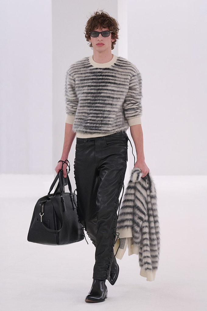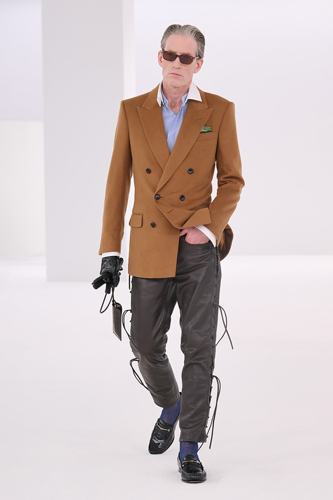 또한 슬림한 가죽 스트랩으로 포인트를 준 깊게 파인 팬츠로 브랜드 창립자에게 경의를 표했다.