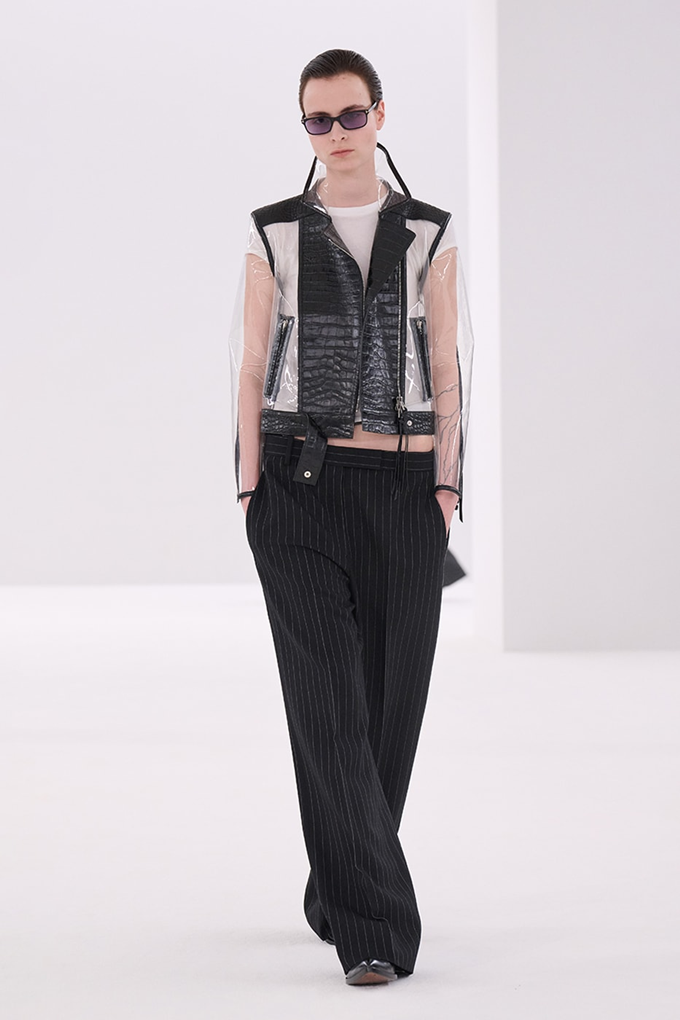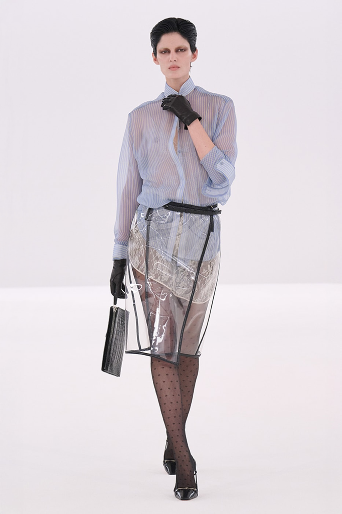 시스루 셔츠부터 투명한 재킷, 스커트, 트렌치 코트, 레인햇 등 투명한 소재를 활용한 아이템은 영화 '아메리칸 사이코'를 연상시키는 시크함을 연출했다 .