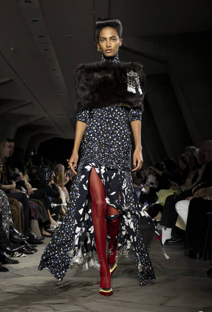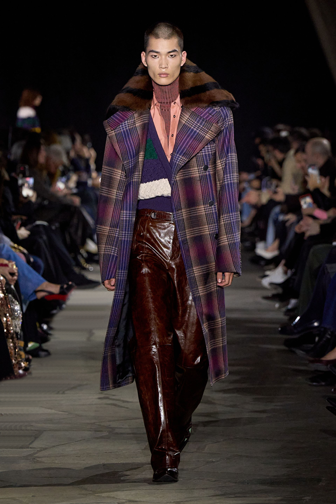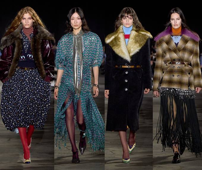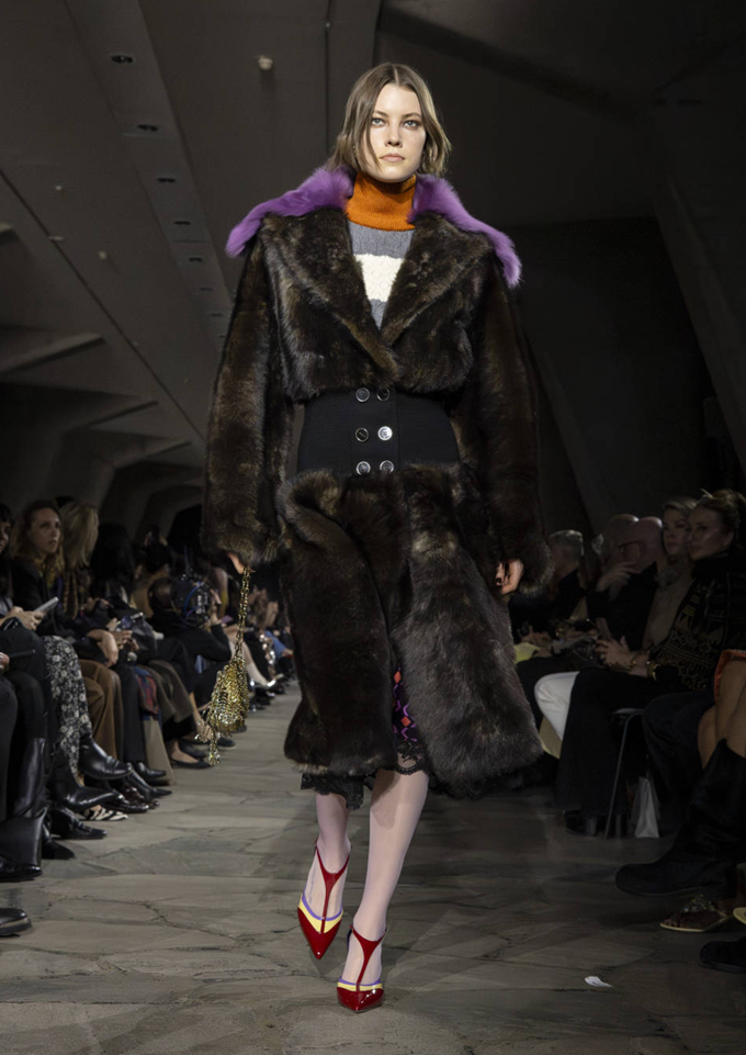 달콤한 핑크, 청록색, 애니멀, 줄무늬 패턴의 모피는 코트와 가죽 재킷의 칼라에 적용되었고, 더욱 예상치 못한 방식으로 정장 재킷에도 사용되었다.