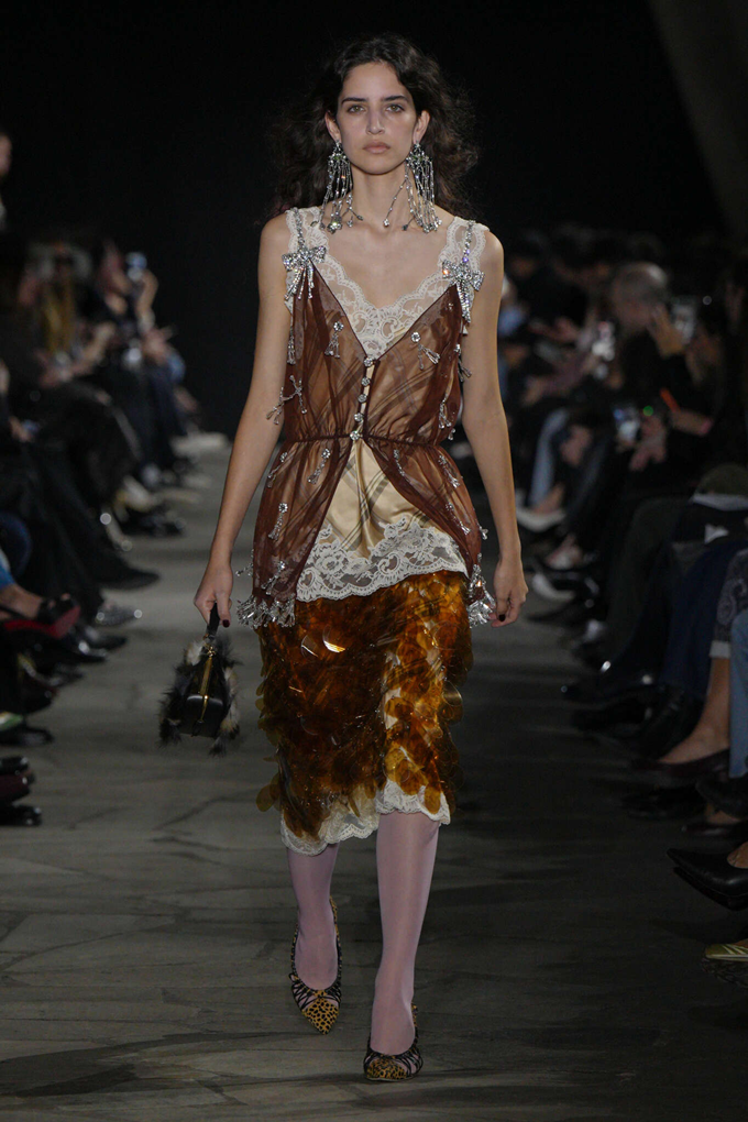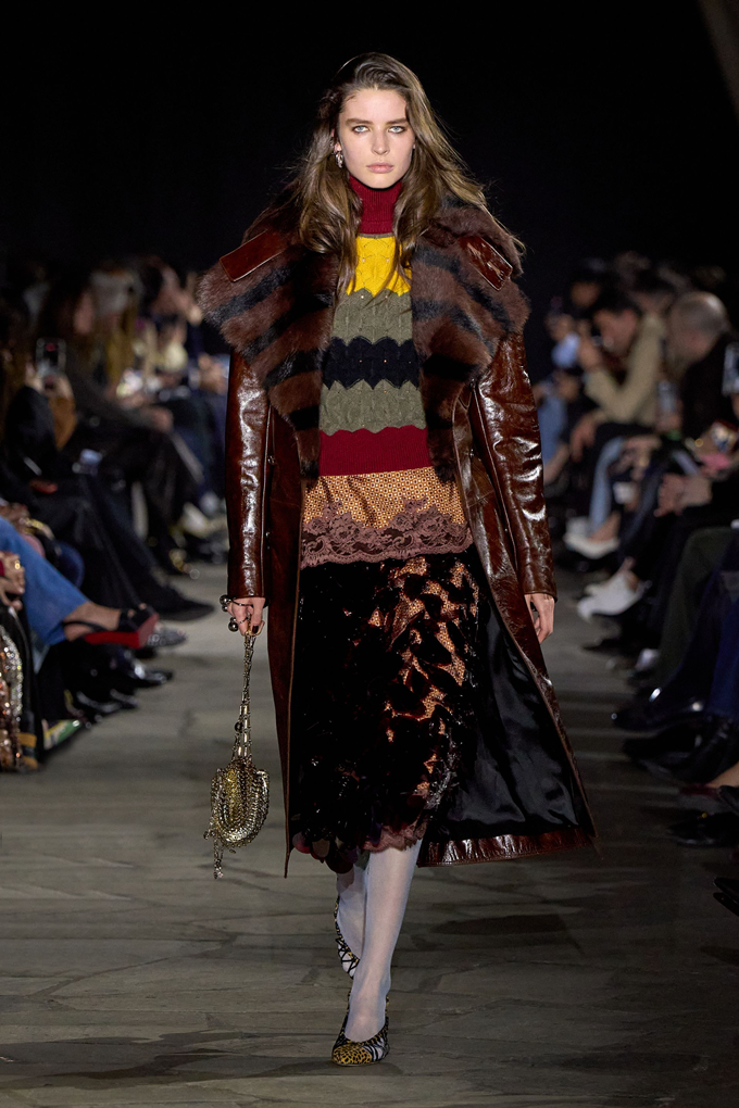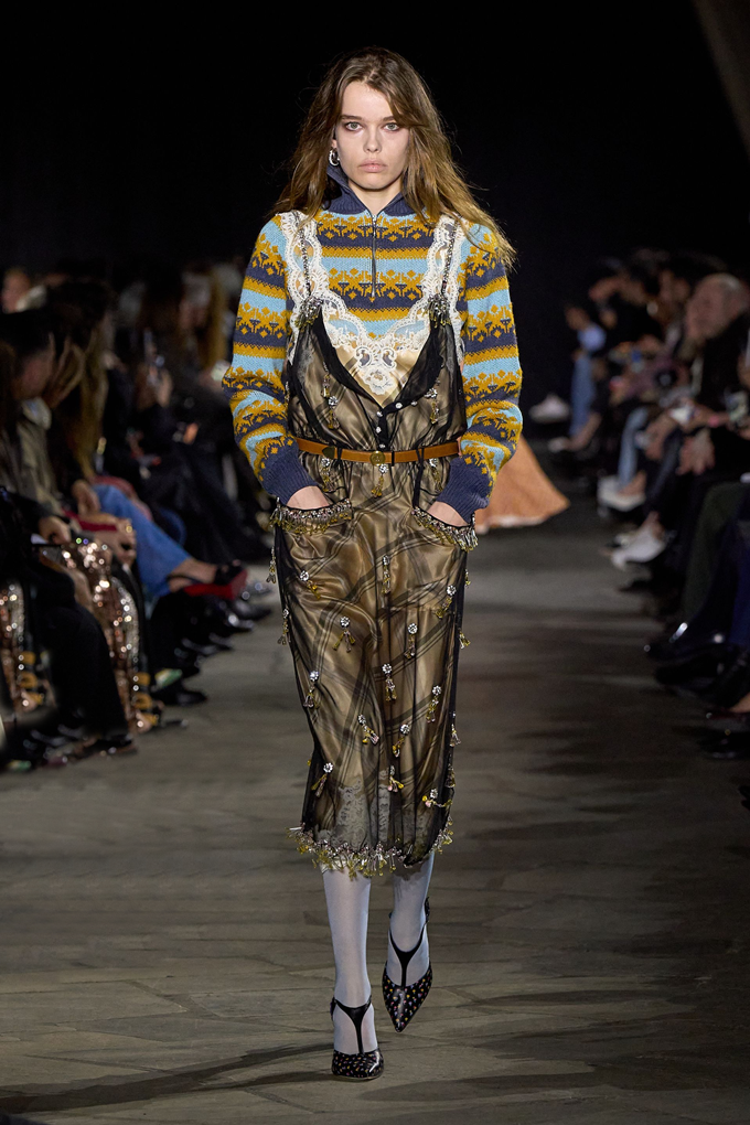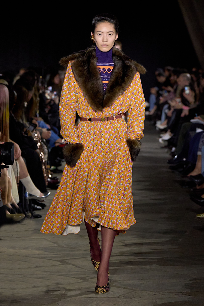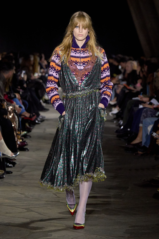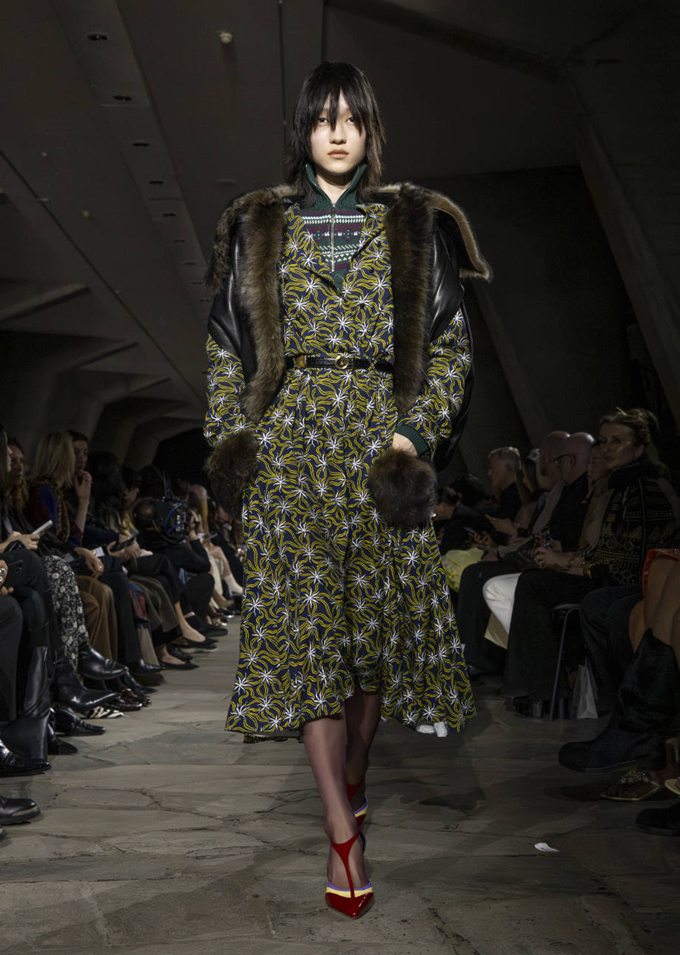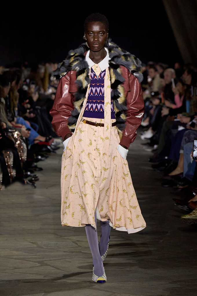 긴 꽃무늬 드레스는 하이브리드 재킷, 빈티지한 집업 점퍼와 짝을 이루고, 피터팬 칼라의 연노란색 긴 드레스는 보라색과 오렌지색 기하학적 패턴의 점퍼, 또는 카모플라주 프린트의 시어링 가죽 코트와 레이어링했다.