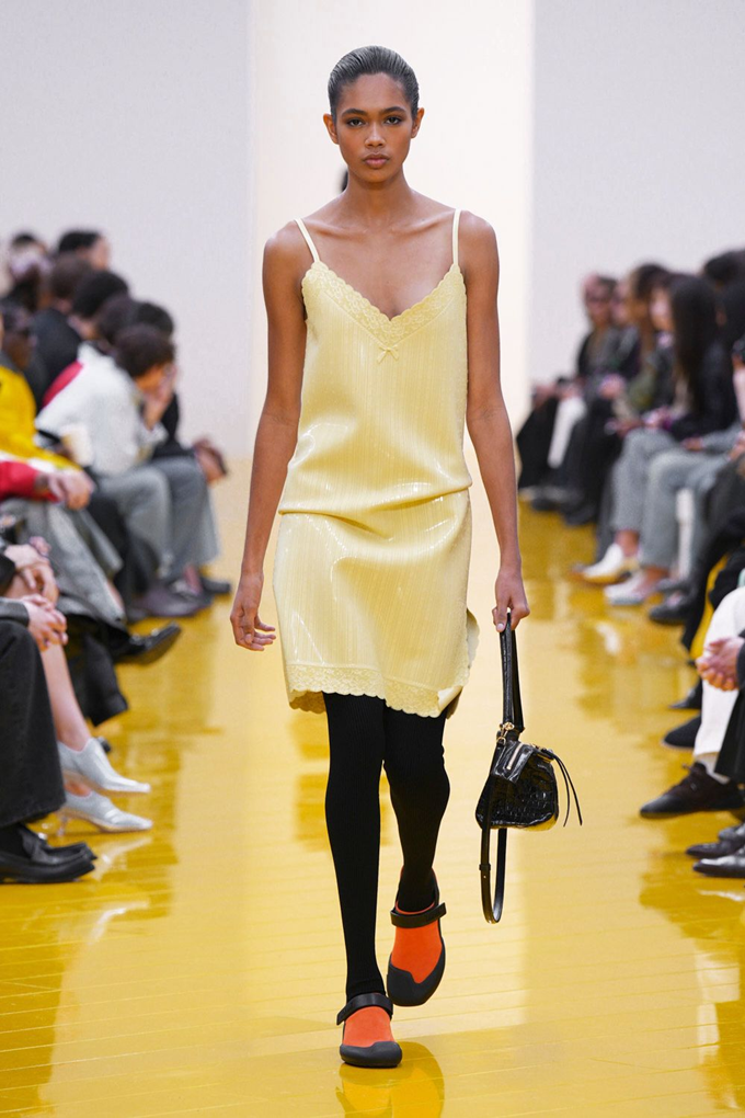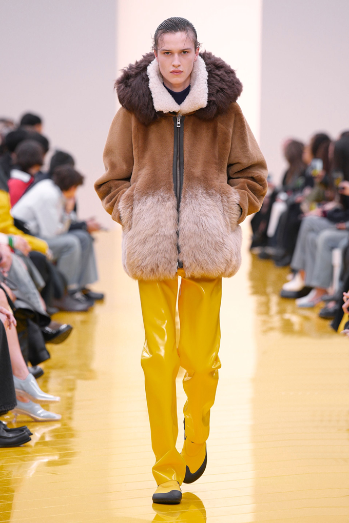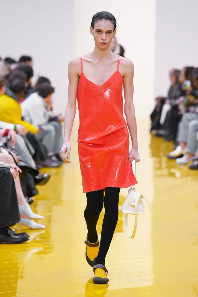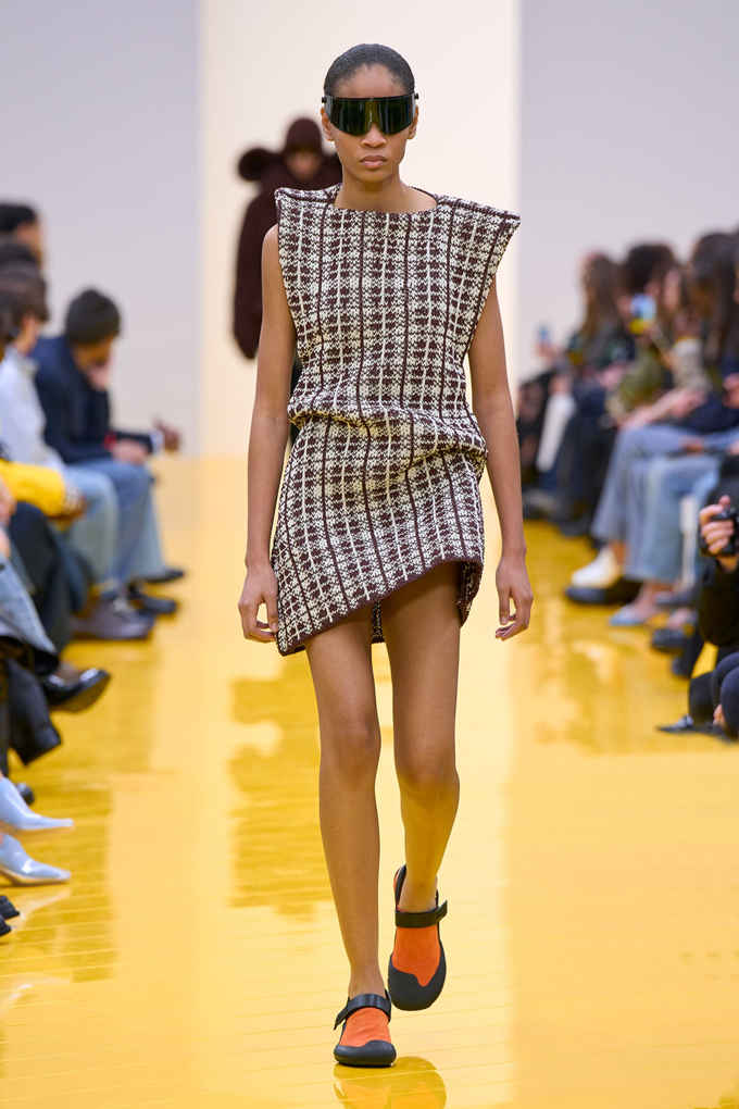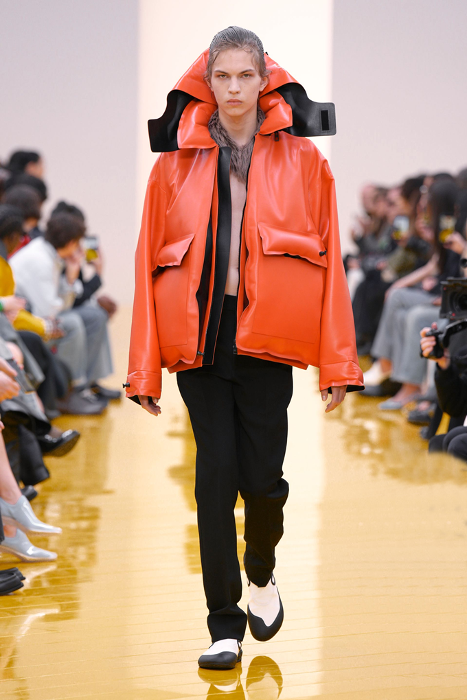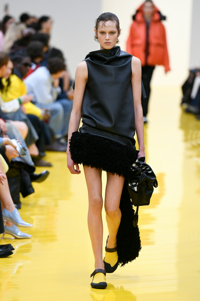 아우터와 가죽 레인코트는 공기를 주입하여 부풀린 채널을 만들며 감각적인 충격을 안겨주고, 원색의 가죽 미니드레스, 구조적인 블레이저, 사선 스커트는 마치 몸에서 분리된 듯한 라인을 만들고 프린지, 숨겨진 패널, 주름 디테일은 의상에 움직임을 더했다.