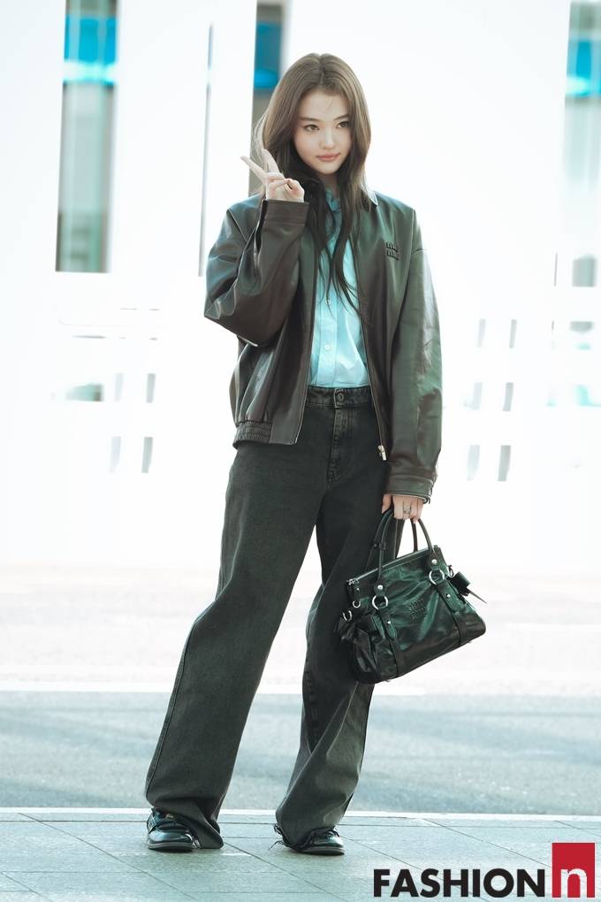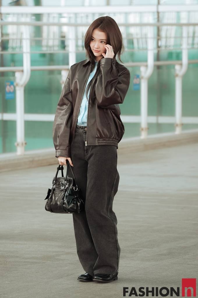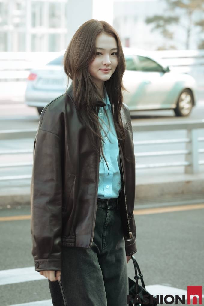 [패션엔 포토] 미야오 엘라, 가죽 재킷을 입어도 인형 미모! 청량 셔츠에 레더 재킷 파리 출국