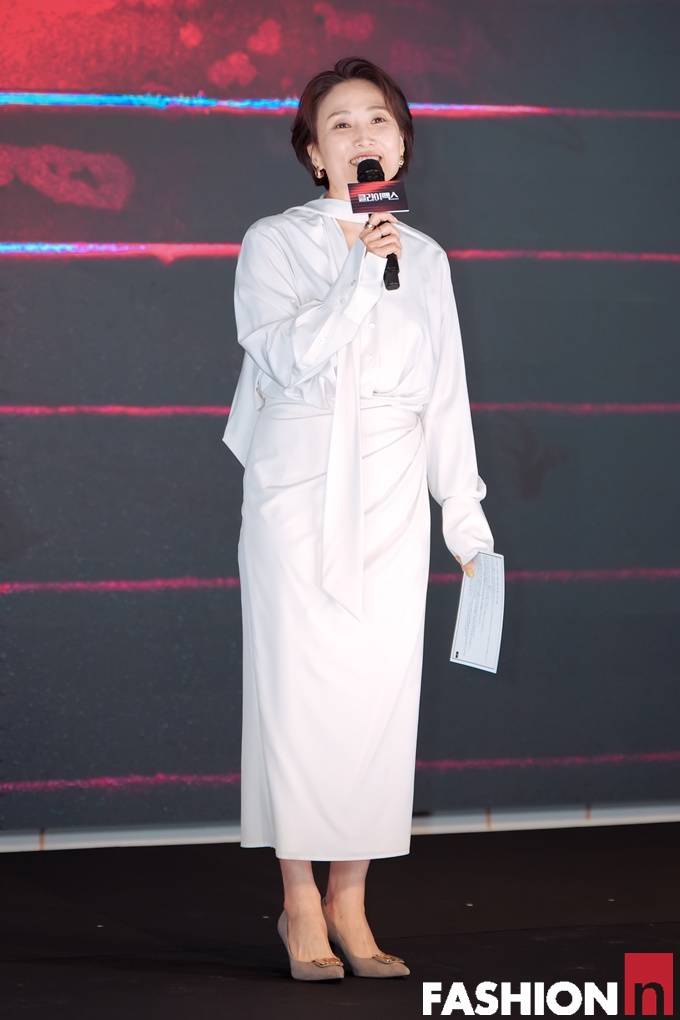 방송인 박경림이 화이트 드레이핑 원피스룩으로 상큼한 분위기의 우아한 MC룩을 연출했다.