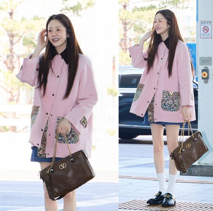이날 고현정은 화사한 핑크 컬러의 하프 코트와 로맨틱한 플라워 패턴 디테일의 데님 쇼츠를 매치한 소녀같은 봄맞이 룩으로 나이를 거스른 동안 미모를 빛냈다.